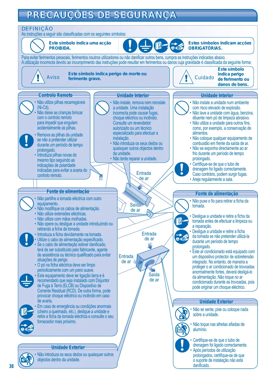 Unidade Interior • Não instale, remova nem reinstale a unidade. Uma instalação incorrecta pode causar fugas, choque eléctrico ou incêndio. Consulte um revendedor autorizado ou um técnico especializado para efectuar a instalação. • Não introduza os seus dedos ou quaisquer outros objectos dentro da unidade. • Não tente reparar a unidade.