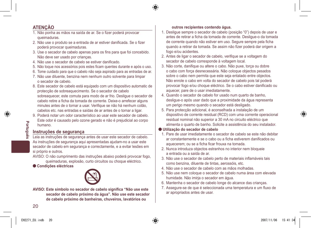 Este odor é causado pelo ozone gerado e não é prejudicial ao corpo humano. Instruções de segurança Leia as instruções de segurança antes de usar este secador de cabelo. As instruções de segurança aqui apresentadas ajudam-no a usar este secador de cabelo em segurança e correctamente, e a evitar lesões em si próprio e outros. AVISO: O não cumprimento das instruções abaixo poderá provocar fogo, queimaduras, explosão, curto circuitos ou choque eléctrico. Condições eléctricas AVISO: E ste símbolo no secador de cabelo significa “Não use este secador de cabelo próximo da água”. Não use este secador de cabelo próximo de banheiras, chuveiros, lavatórios ou outros recipientes contendo água.