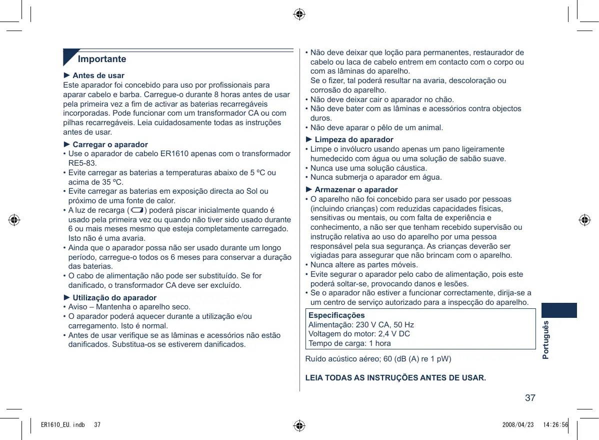 Este aparador foi concebido para uso por professionais para aparar cabelo e barba. Carregue-o durante 8 horas antes de usar pela第一位 vez a fim de activar as baterias recarregaveis incorporadas. Pode funciona com um transformador CA ou com pilhas recarregaveis. Leia cuidadosamente todas as instruções antes de usar.