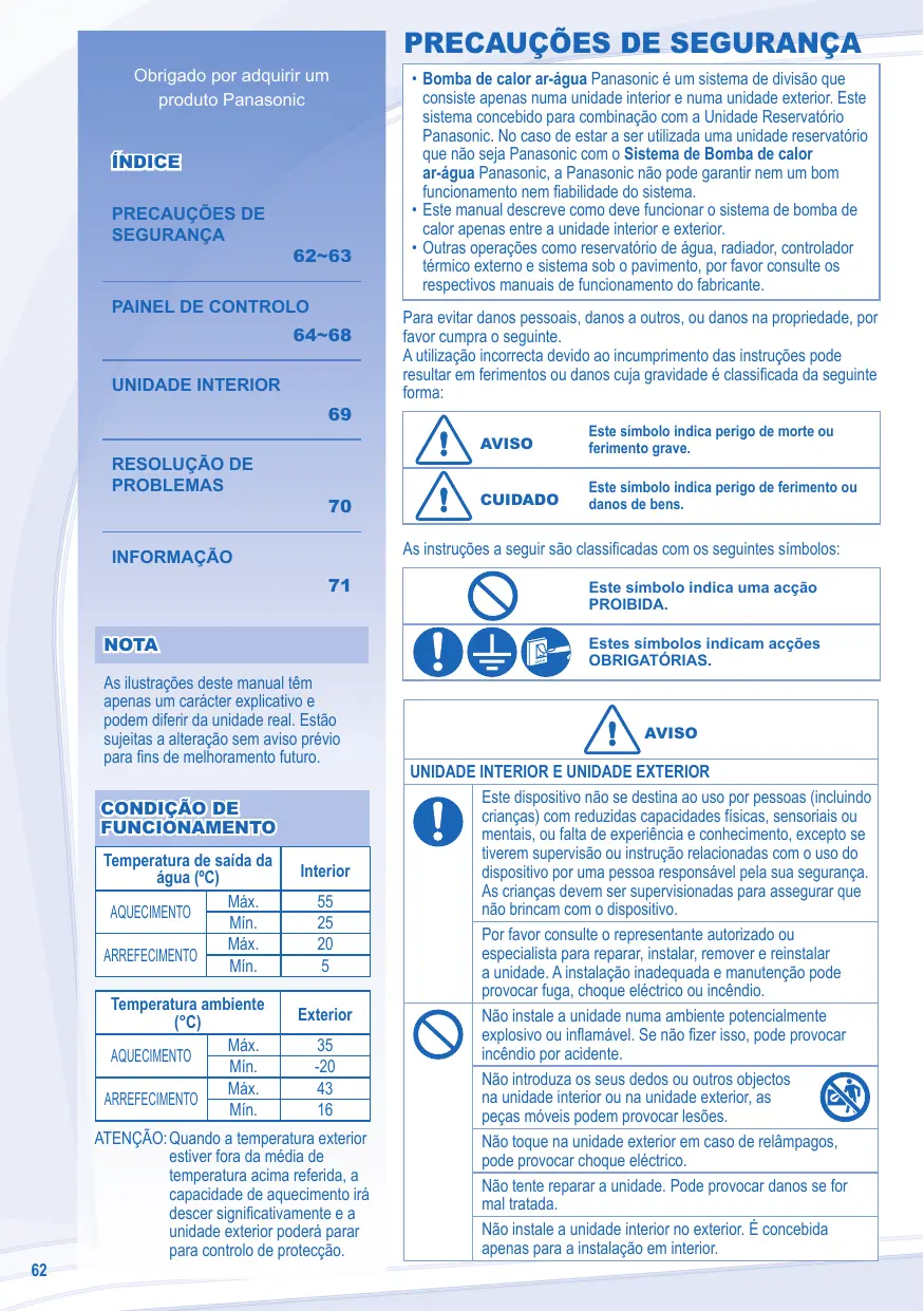 AVISO Este símbolo indica perigo de morte ou ferimento grave. CUIDADO Este símbolo indica perigo de ferimento ou danos de bens. Este símbolo indica uma acção PROIBIDA. Estes símbolos indicam acções OBRIGATÓRIAS. As ilustrações deste manual têm apenas um carácter explicativo e podem diferir da unidade real. Estão sujeitas a alteração sem aviso prévio para fins de melhoramento futuro. Temperatura ambiente (°C) Máx. AQUECIMENTO Mín. Máx. ARREFECIMENTO Mín. Para evitar danos pessoais, danos a outros, ou danos na propriedade, por favor cumpra o seguinte. A utilização incorrecta devido ao incumprimento das instruções pode resultar em ferimentos ou danos cuja gravidade é classificada da seguinte forma: As instruções a seguir são classificadas com os seguintes símbolos: INFORMAÇÃO Temperatura de saída da água (ºC) Máx. AQUECIMENTO Mín. Máx. ARREFECIMENTO Mín.