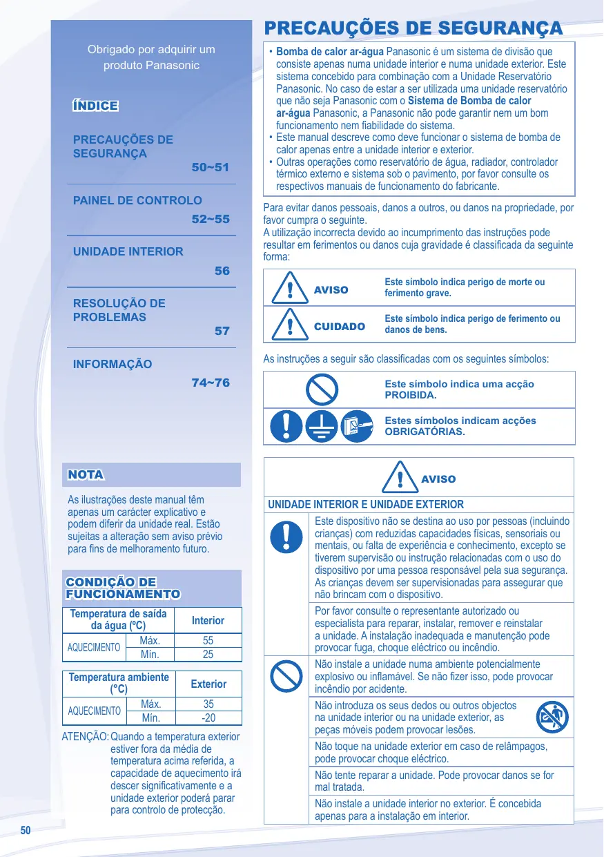 NOTA AVISO As ilustrações deste manual têm apenas um carácter explicativo e podem diferir da unidade real. Estão sujeitas a alteração sem aviso prévio para fins de melhoramento futuro. CONDIÇÃO DE FUNCIONAMENTO Temperatura de saída da água (ºC) Máx. AQUECIMENTO Mín. Temperatura ambiente (°C) Máx. AQUECIMENTO Mín.