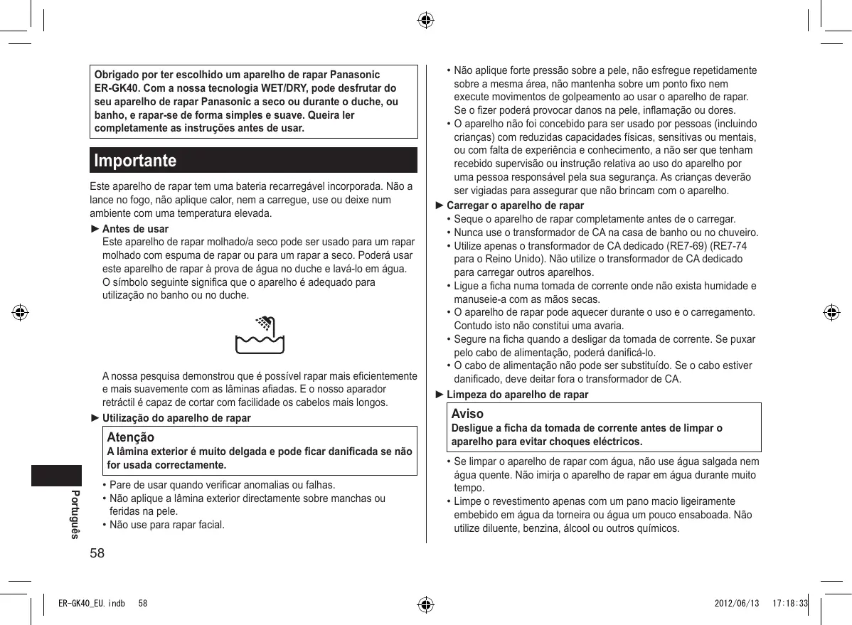 2012/06/13 17:18:33 Obrigado por ter escolhido um aparelho de rapar Panasonic ER‑GK40. Com a nossa tecnologia WET/DRY, pode desfrutar do seu aparelho de rapar Panasonic a seco ou durante o duche, ou banho, e rapar-se de forma simples e suave. Queira ler completamente as instruções antes de usar. Importante Este aparelho de rapar tem uma bateria recarregável incorporada. Não a lance no fogo, não aplique calor, nem a carregue, use ou deixe num ambiente com uma temperatura elevada. ► Antes de usar Este aparelho de rapar molhado/a seco pode ser usado para um rapar molhado com espuma de rapar ou para um rapar a seco. Poderá usar este aparelho de rapar à prova de água no duche e lavá-lo em água. O símbolo seguinte significa que o aparelho é adequado para utilização no banho ou no duche. A nossa pesquisa demonstrou que é possível rapar mais eficientemente e mais suavemente com as lâminas afiadas. E o nosso aparador retráctil é capaz de cortar com facilidade os cabelos mais longos. ► Utilização do aparelho de rapar Atenção A lâmina exterior é muito delgada e pode ficar danificada se não for usada correctamente. Português