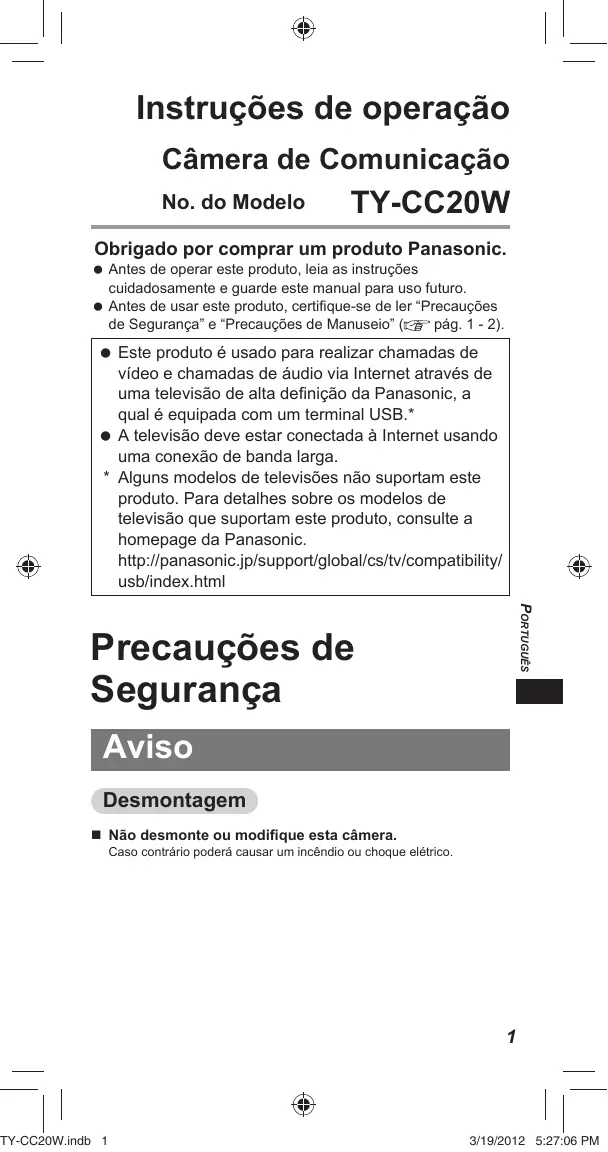 Este produit é uso para realizar chamadas de video e chamadas de audio via Internet atraves de uma televisão de alta definição da Panasonic, a qual é equipada com um terminal USB.*