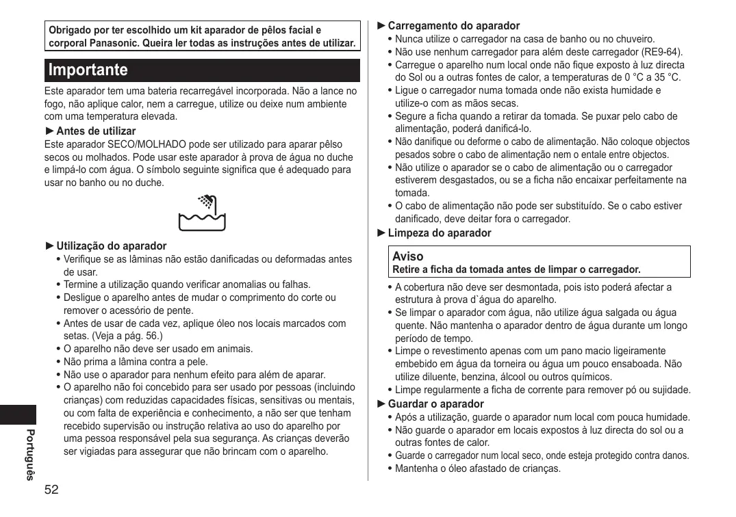 • Nunca utilize o carregador na casa de banho ou no chuveiro. • Não use nenhum carregador para além deste carregador (RE9‑64). • Carregue o aparelho num local onde não fique exposto à luz directa do Sol ou a outras fontes de calor, a temperaturas de 0 °C a 35 °C. • Ligue o carregador numa tomada onde não exista humidade e utilize-o com as mãos secas. • Segure a ficha quando a retirar da tomada. Se puxar pelo cabo de alimentação, poderá danificá-lo. • Não danifique ou deforme o cabo de alimentação. Não coloque objectos pesados sobre o cabo de alimentação nem o entale entre objectos. • Não utilize o aparador se o cabo de alimentação ou o carregador estiverem desgastados, ou se a ficha não encaixar perfeitamente na tomada. • O cabo de alimentação não pode ser substituído. Se o cabo estiver danificado, deve deitar fora o carregador.