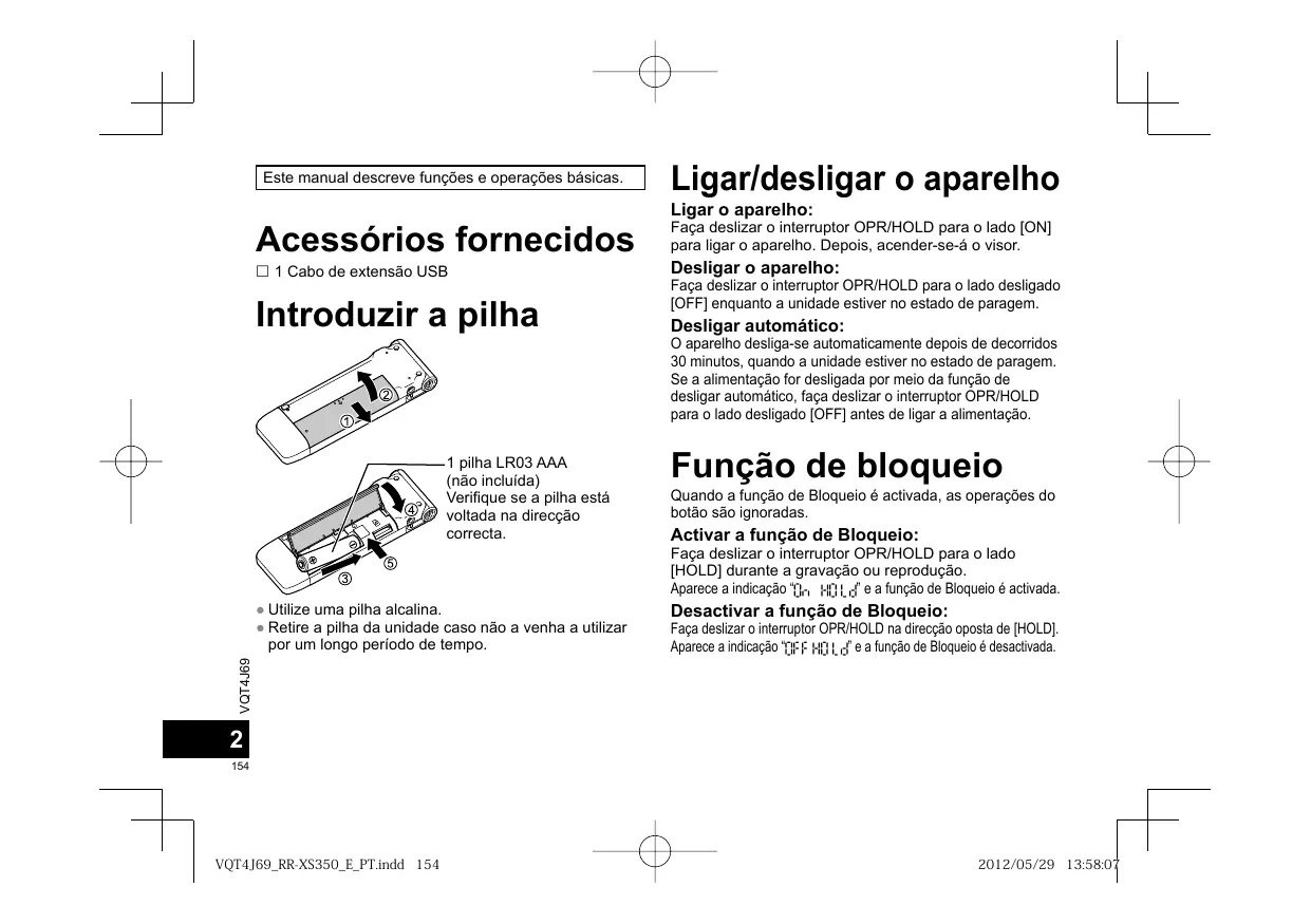 VQT4J69̲RR-XS350̲E̲SP.indd 153 2012/05/29 14:19:59 Este manual descreve funções e operações básicas. Ligar/desligar o aparelho Ligar o aparelho: Acessórios fornecidos 1 Cabo de extensão USB Introduzir a pilha Faça deslizar o interruptor OPR/HOLD para o lado [ON] para ligar o aparelho. Depois, acender-se-á o visor. Desligar o aparelho: Faça deslizar o interruptor OPR/HOLD para o lado desligado [OFF] enquanto a unidade estiver no estado de paragem. Desligar automático: O aparelho desliga-se automaticamente depois de decorridos 30 minutos, quando a unidade estiver no estado de paragem. Se a alimentação for desligada por meio da função de desligar automático, faça deslizar o interruptor OPR/HOLD para o lado desligado [OFF] antes de ligar a alimentação. 1 pilha LR03 AAA (não incluída) Verifique se a pilha está voltada na direcção correcta. Função de bloqueio Quando a função de Bloqueio é activada, as operações do botão são ignoradas. Activar a função de Bloqueio: Faça deslizar o interruptor OPR/HOLD para o lado [HOLD] durante a gravação ou reprodução. Aparece a indicação “ ” e a função de Bloqueio é activada. Desactivar a função de Bloqueio: Faça deslizar o interruptor OPR/HOLD na direcção oposta de [HOLD]. Aparece a indicação “ ” e a função de Bloqueio é desactivada. VQT4J69 ● Utilize uma pilha alcalina. ● Retire a pilha da unidade caso não a venha a utilizar por um longo período de tempo.