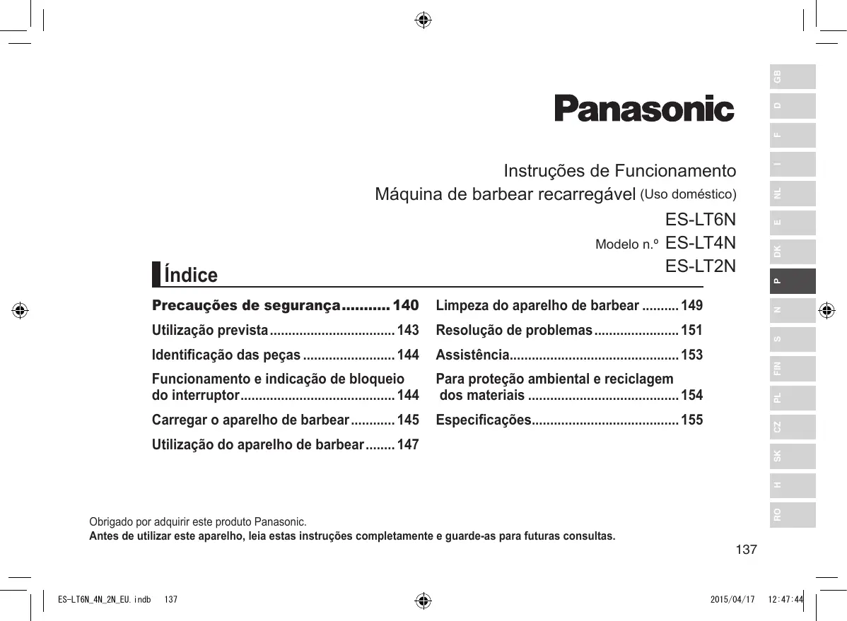 Índice Instruções de Funcionamento Máquina de barbear recarregável (Uso doméstico) ES‑LT6N Modelo n.º ES‑LT4N ES‑LT2N Obrigado por adquirir este produto Panasonic. Antes de utilizar este aparelho, leia estas instruções completamente e guarde-as para futuras consultas. ES-LT6N_4N_2N_EU.indb
