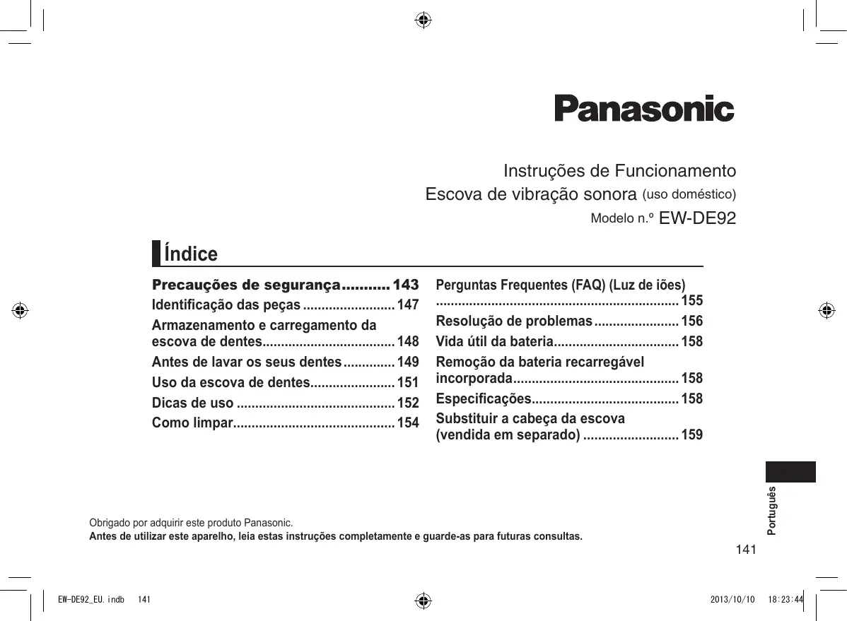 - 2013/10/10 18:23:43 Instruções de Funcionamento Escova de vibração sonora (uso doméstico) Modelo n.º EW‑DE92 Índice Perguntas Frequentes (FAQ) (Luz de iões) Resolução de problemas p. 156