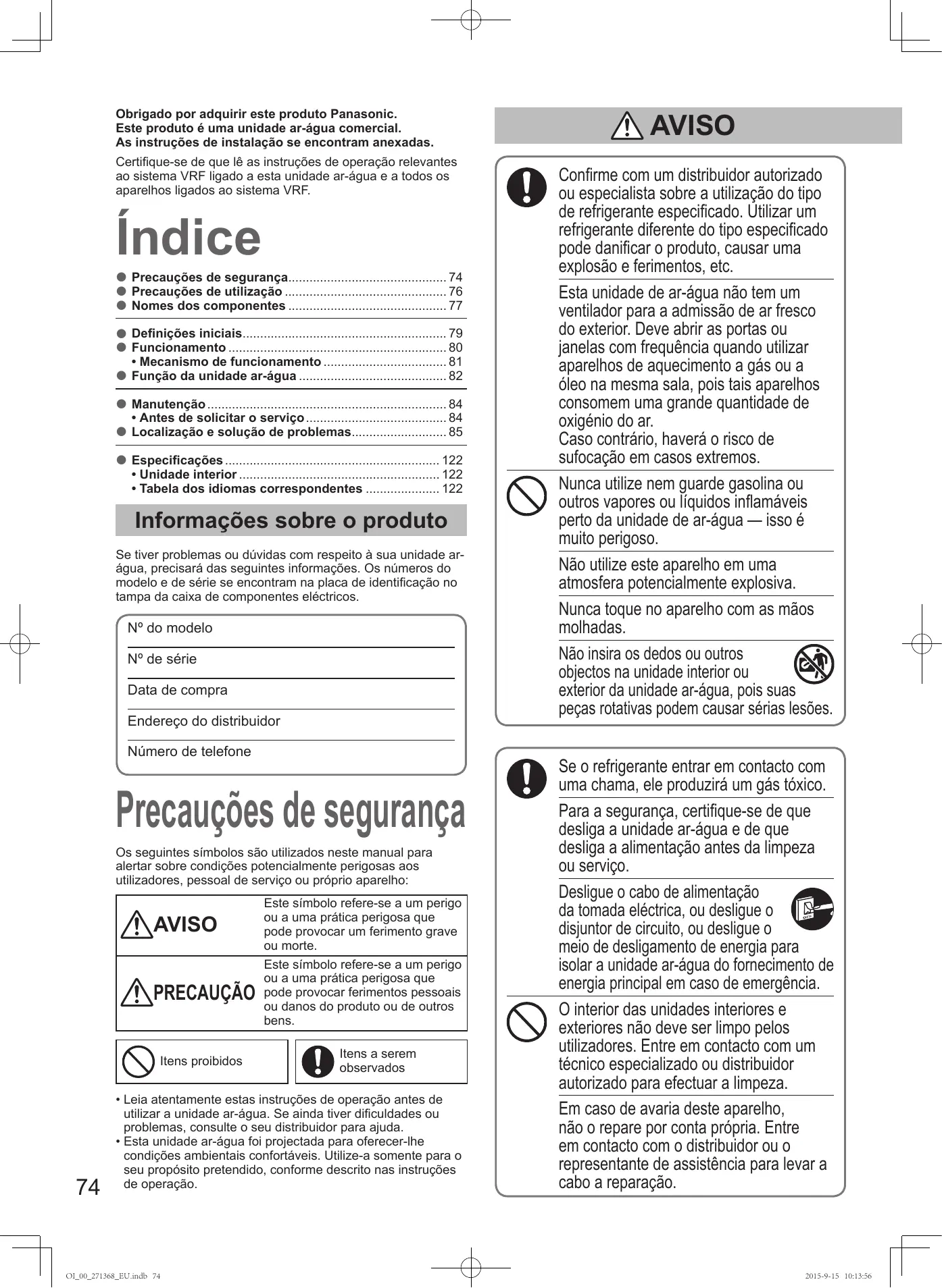 - OI_00_271368_EU.indb 73 2015-9-15 10:13:55 Obrigado por adquirir este produto Panasonic. Este produto é uma unidade ar-água comercial. As instruções de instalação se encontram anexadas. Certifique-se de que lê as instruções de operação relevantes ao sistema VRF ligado a esta unidade ar-água e a todos os aparelhos ligados ao sistema VRF. Índice Precauções de segurança p. 74