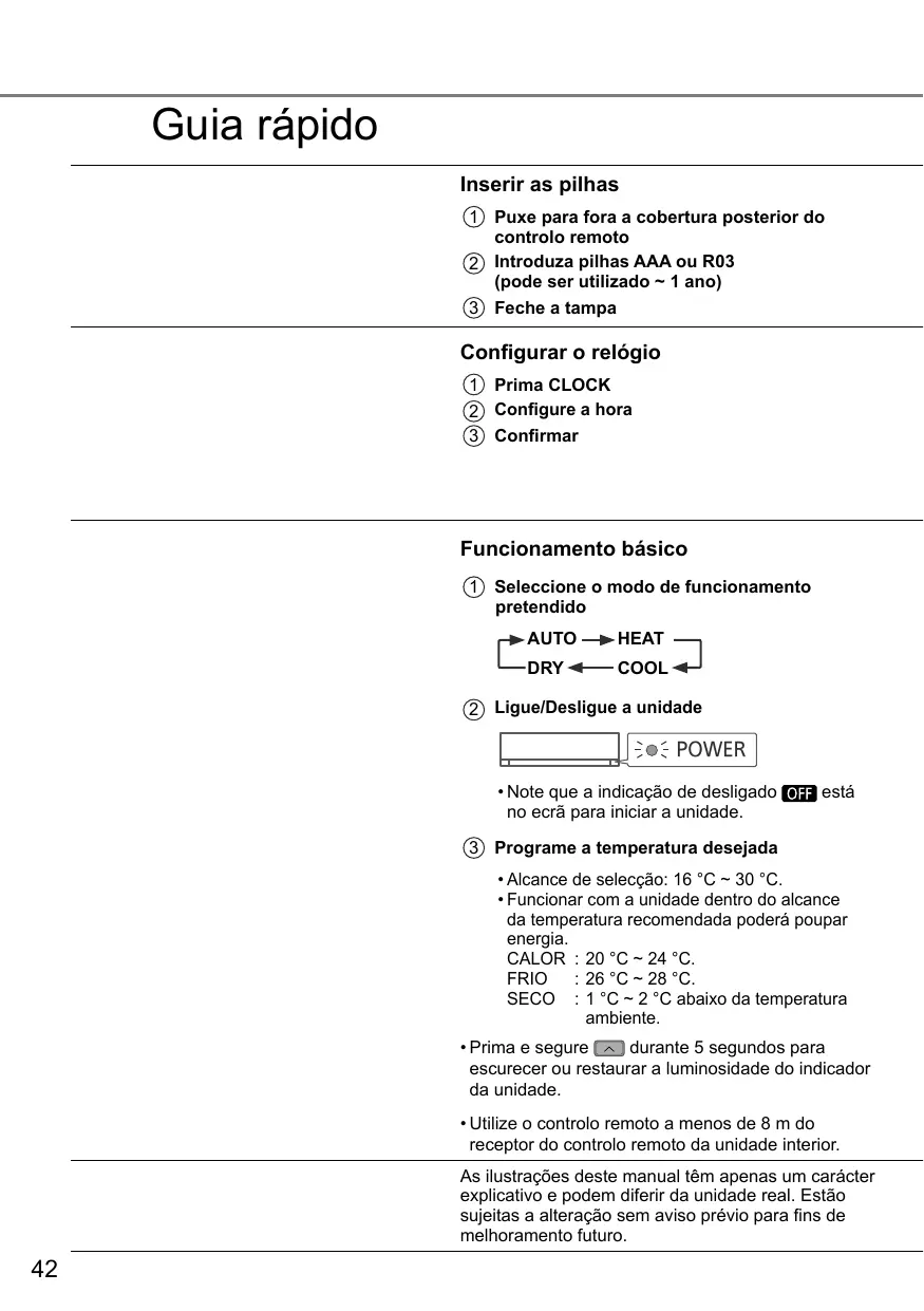 3 Programe a temperatura desejada • Alcance de selecção: 16 °C ~ 30 °C. • Funcionar com a unidade dentro do alcance da temperatura recomendada poderá poupar energia. CALOR : 20 °C ~ 24 °C. FRIO : 26 °C ~ 28 °C. SECO : 1 °C ~ 2 °C abaixo da temperatura ambiente. • Prima e segure durante 5 segundos para escurecer ou restaurar a luminosidade do indicador da unidade. • Utilize o controlo remoto a menos de 8 m do receptor do controlo remoto da unidade interior. As ilustrações deste manual têm apenas um carácter explicativo e podem diferir da unidade real. Estão sujeitas a alteração sem aviso prévio para fins de melhoramento futuro.
