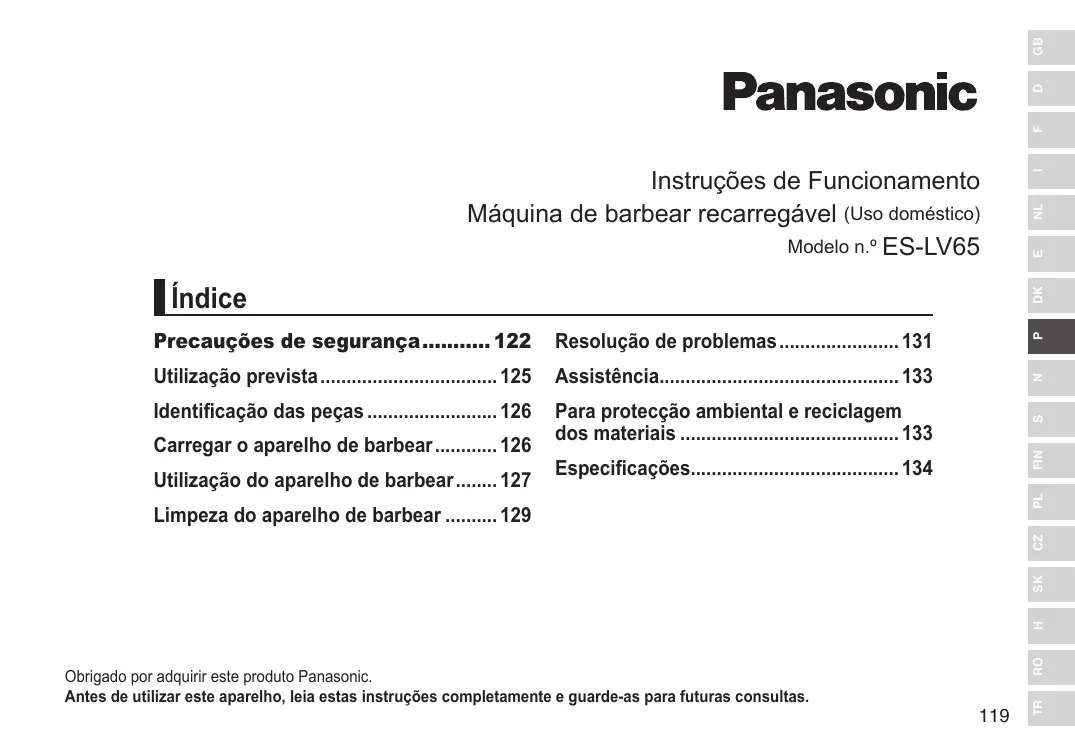 TR Obrigado por adquirir este produto Panasonic. Antes de utilizar este aparelho, leia estas instruções completamente e guarde-as para futuras consultas.
