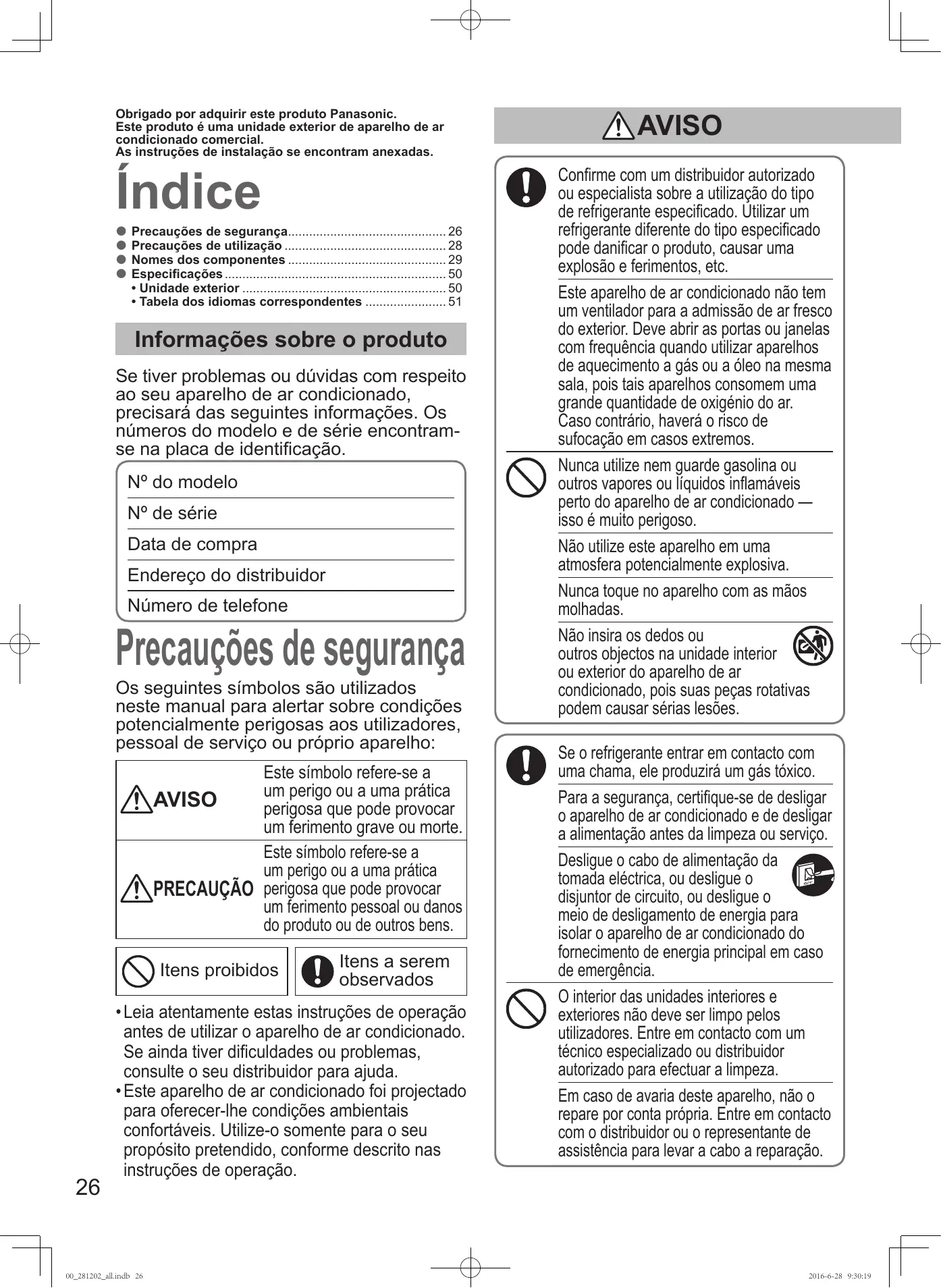- 00_281202_all.indb 25 2016-6-28 9:30:18 Obrigado por adquirir este produto Panasonic. Este produto é uma unidade exterior de aparelho de ar condicionado comercial. As instruções de instalação se encontram anexadas. Índice Precauções de segurança p. 26