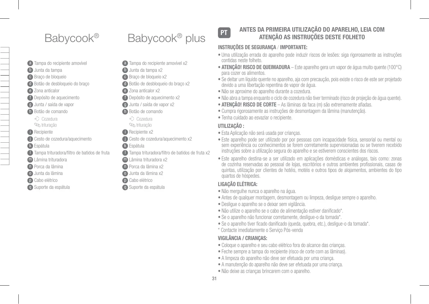 ANTES DA PRIMEIRA UTILIZAÇÃO DO APARELHO, LEIA COM ATENÇÃO AS INSTRUÇÕES DESTE FOLHETO INSTRUÇÕES DE SEGURANÇA / IMPORTANTE: • Uma utilização errada do aparelho pode induzir riscos de lesões: siga rigorosamente as instruções contidas neste folheto. • ATENÇÃO! RISCO DE QUEIMADURA – Este aparelho gera um vapor de água muito quente (100°C) para cozer os alimentos. • Se deitar um líquido quente no aparelho, aja com precaução, pois existe o risco de este ser projetado devido a uma libertação repentina de vapor de água. • Não se aproxime do aparelho durante a cozedura. • Não abra a tampa enquanto o ciclo de cozedura não tiver terminado (risco de projeção de água quente). • ATENÇÃO! RISCO DE CORTE – As lâminas da faca (m) são extremamente afiadas. • Cumpra rigorosamente as instruções de desmontagem da lâmina (manutenção). • Tenha cuidado ao esvaziar o recipiente.