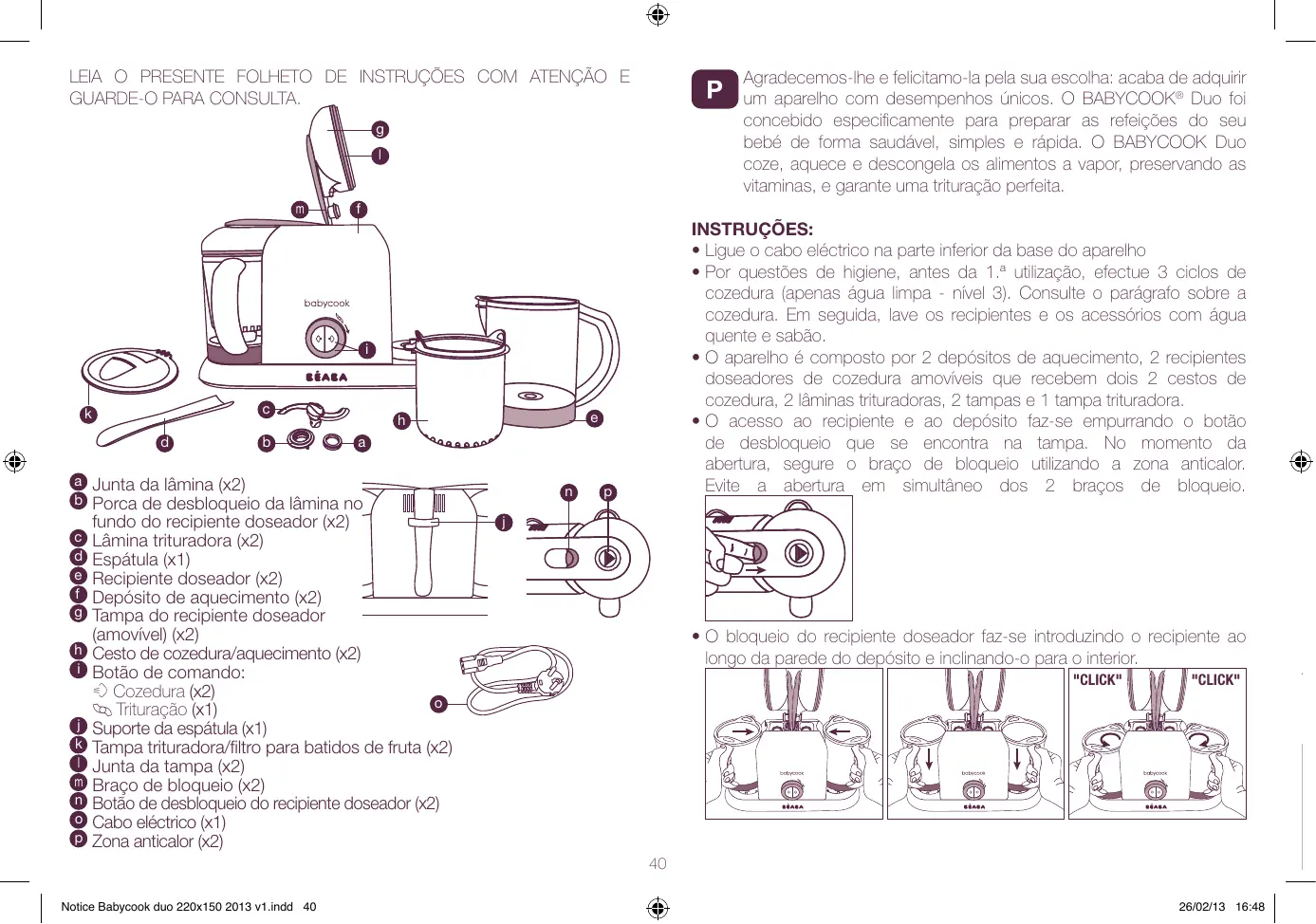 Encontre gratuitamente o manual do aparelho BABYCOOK DUO BEABA em formato PDF.