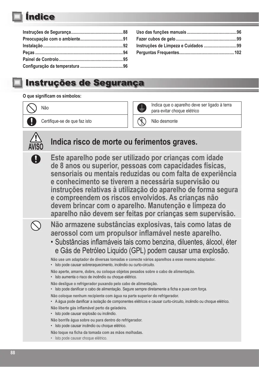 AVISO Indica risco de morte ou ferimentos graves. Este aparelho pode ser utilizado por crianças com idade de 8 anos ou superior, pessoas com capacidades físicas, sensoriais ou mentais reduzidas ou com falta de experiência e conhecimento se tiverem a necessária supervisão ou instruções relativas à utilização do aparelho de forma segura e compreendem os riscos envolvidos. As crianças não devem brincar com o aparelho. Manutenção e limpeza do aparelho não devem ser feitas por crianças sem supervisão. Não armazene substâncias explosivas, tais como latas de aerossol com um propulsor inflamável neste aparelho. • Substâncias inflamáveis tais como benzina, diluentes, álcool, éter e Gás de Petróleo Liquido (GPL) podem causar uma explosão. Não use um adaptador de diversas tomadas e conecte vários aparelhos a esse mesmo adaptador. • Isto pode causar sobreraquecimento, incêndio ou curto-circuito. Não aperte, amarre, dobre, ou coloque objetos pesados sobre o cabo de alimentação. • Isto aumenta o risco de incêndio ou choque elétrico. Não desligue o refrigerador puxando pelo cabo de alimentação. • Isto pode danificar o cabo de alimentação. Segure sempre diretamente a ficha e puxe com força. Não coloque nenhum recipiente com água na parte superior do refrigerador. • A água pode danificar a isolação de componentes elétricos e causar curto-circuito, incêndio ou choque elétrico. Não liberte gás inflamável perto da geladeira. • Isto pode causar explosão ou incêndio. Não borrife água sobre ou para dentro do refrigerador. • Isto pode causar incêndio ou choque elétrico. Não toque na ficha da tomada com as mãos molhadas. • Isto pode causar choque elétrico.