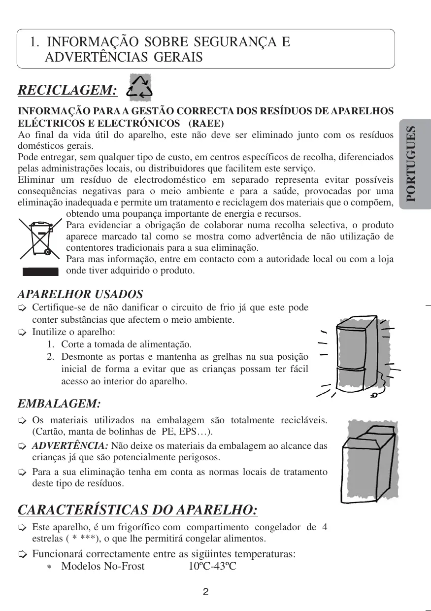inicial de forma a evitar que as crianças possam ter fácil acesso ao interior do aparelho. EMBALAGEM: Os materiais utilizados na embalagem são totalmente recicláveis. (Cartão, manta de bolinhas de PE, EPS…). ADVERTÊNCIA: Não deixe os materiais da embalagem ao alcance das crianças já que são potencialmente perigosos. Para a sua eliminação tenha em conta as normas locais de tratamento deste tipo de resíduos. CARACTERÍSTICAS DO APARELHO: Este aparelho, é um frigorífico com compartimento congelador de 4 estrelas ( * ***), o que lhe permitirá congelar alimentos. Funcionará correctamente entre as sigüintes temperaturas: