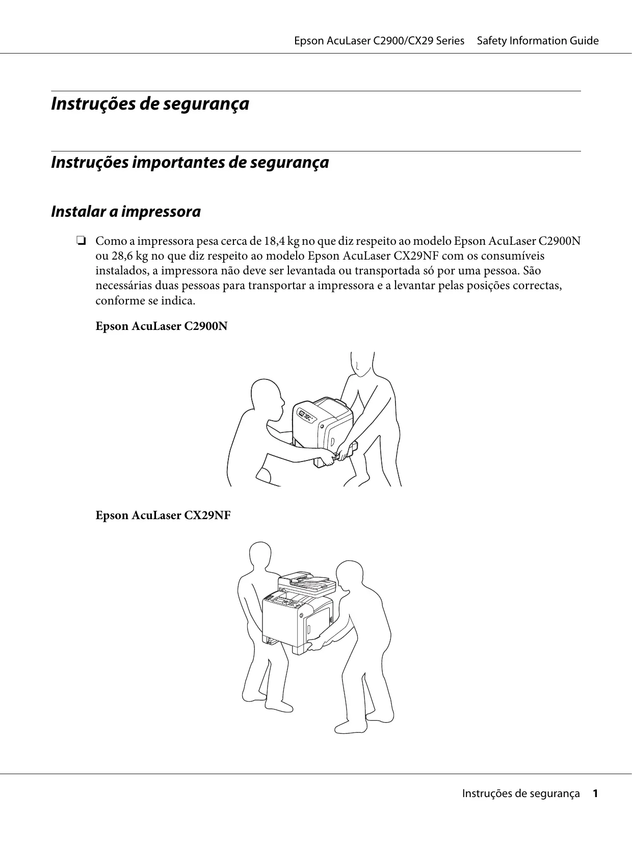 Instruções de segurança Instruções importantes de segurança Instalar a impressora ❏ Como a impressora pesa cerca de 18,4 kg no que diz respeito ao modelo Epson AcuLaser C2900N ou 28,6 kg no que diz respeito ao modelo Epson AcuLaser CX29NF com os consumíveis instalados, a impressora não deve ser levantada ou transportada só por uma pessoa. São necessárias duas pessoas para transportar a impressora e a levantar pelas posições correctas, conforme se indica.