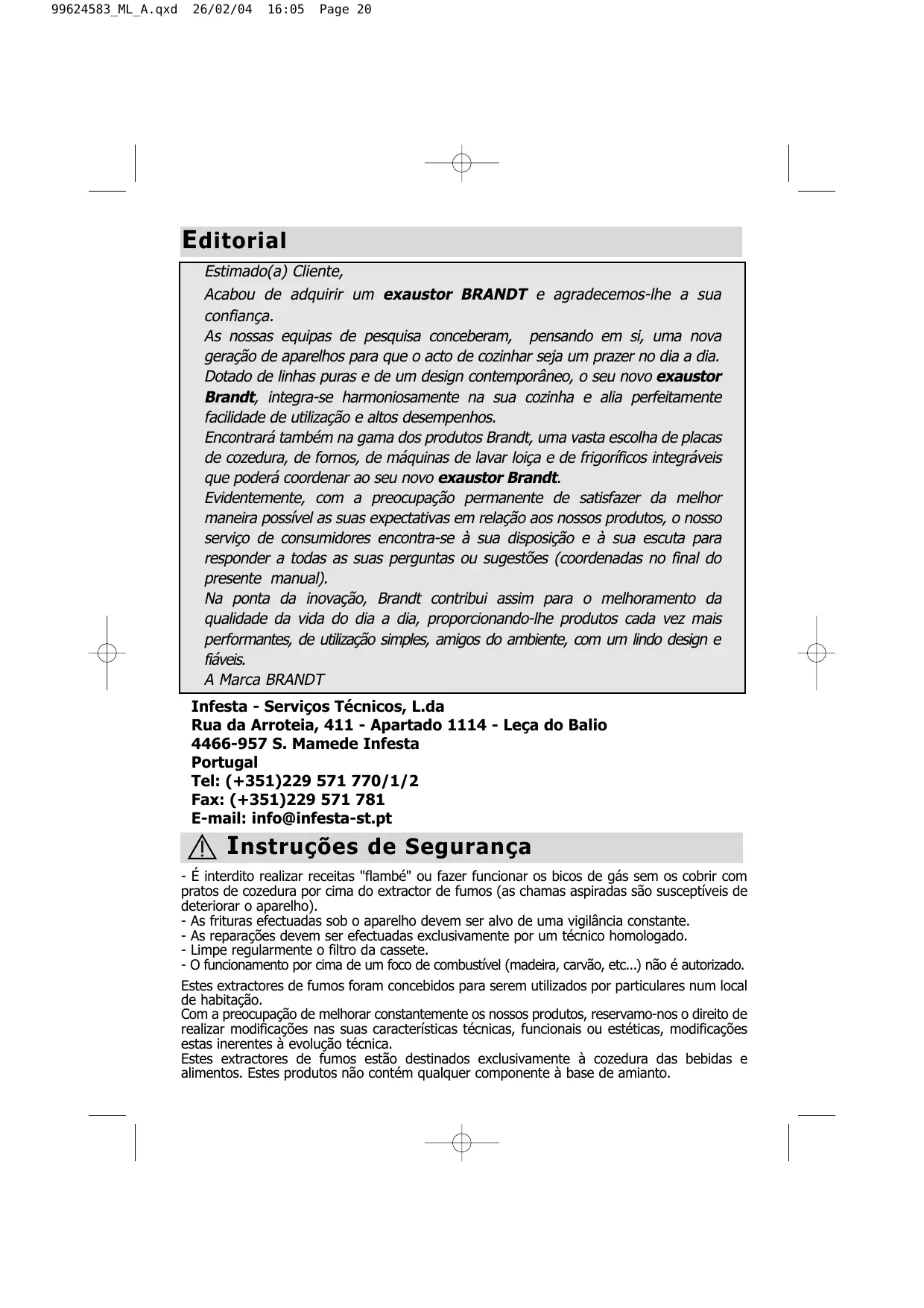 99624583_ML_A.qxd 26/02/04 16:05 Page 20 E ditorial Estimado(a) Cliente, Acabou de adquirir um exaustor BRANDT e agradecemos-lhe a sua confiança. As nossas equipas de pesquisa conceberam, pensando em si, uma nova geração de aparelhos para que o acto de cozinhar seja um prazer no dia a dia. Dotado de linhas puras e de um design contemporâneo, o seu novo exaustor Brandt, integra-se harmoniosamente na sua cozinha e alia perfeitamente facilidade de utilização e altos desempenhos. Encontrará também na gama dos produtos Brandt, uma vasta escolha de placas de cozedura, de fornos, de máquinas de lavar loiça e de frigoríficos integráveis que poderá coordenar ao seu novo exaustor Brandt. Evidentemente, com a preocupação permanente de satisfazer da melhor maneira possível as suas expectativas em relação aos nossos produtos, o nosso serviço de consumidores encontra-se à sua disposição e à sua escuta para responder a todas as suas perguntas ou sugestões (coordenadas no final do presente manual). Na ponta da inovação, Brandt contribui assim para o melhoramento da qualidade da vida do dia a dia, proporcionando-lhe produtos cada vez mais performantes, de utilização simples, amigos do ambiente, com um lindo design e fiáveis. A Marca BRANDT Infesta - Serviços Técnicos, L.da Rua da Arroteia, 411 - Apartado 1114 - Leça do Balio 4466-957 S. Mamede Infesta Portugal Tel: (+351)229 571 770/1/2 Fax: (+351)229 571 781 E-mail: info@infesta-st.pt I nstruções de Segurança - É interdito realizar receitas "flambé" ou fazer funcionar os bicos de gás sem os cobrir com pratos de cozedura por cima do extractor de fumos (as chamas aspiradas são susceptíveis de deteriorar o aparelho). - As frituras efectuadas sob o aparelho devem ser alvo de uma vigilância constante. - As reparações devem ser efectuadas exclusivamente por um técnico homologado. - Limpe regularmente o filtro da cassete. - O funcionamento por cima de um foco de combustível (madeira, carvão, etc...) não é autorizado. Estes extractores de fumos foram concebidos para serem utilizados por particulares num local de habitação. Com a preocupação de melhorar constantemente os nossos produtos, reservamo-nos o direito de realizar modificações nas suas características técnicas, funcionais ou estéticas, modificações estas inerentes à evolução técnica. Estes extractores de fumos estão destinados exclusivamente à cozedura das bebidas e alimentos. Estes produtos não contém qualquer componente à base de amianto. 99624583_ML_A.qxd 26/02/04 16:05 Page 21 Ao longo do folheto, assina-lhe as instruções de segurança, assinala-lhe os conselhos e as astúcias C omo se apresenta o seu exaustor? Fig.1 Modelo 3 velocidades