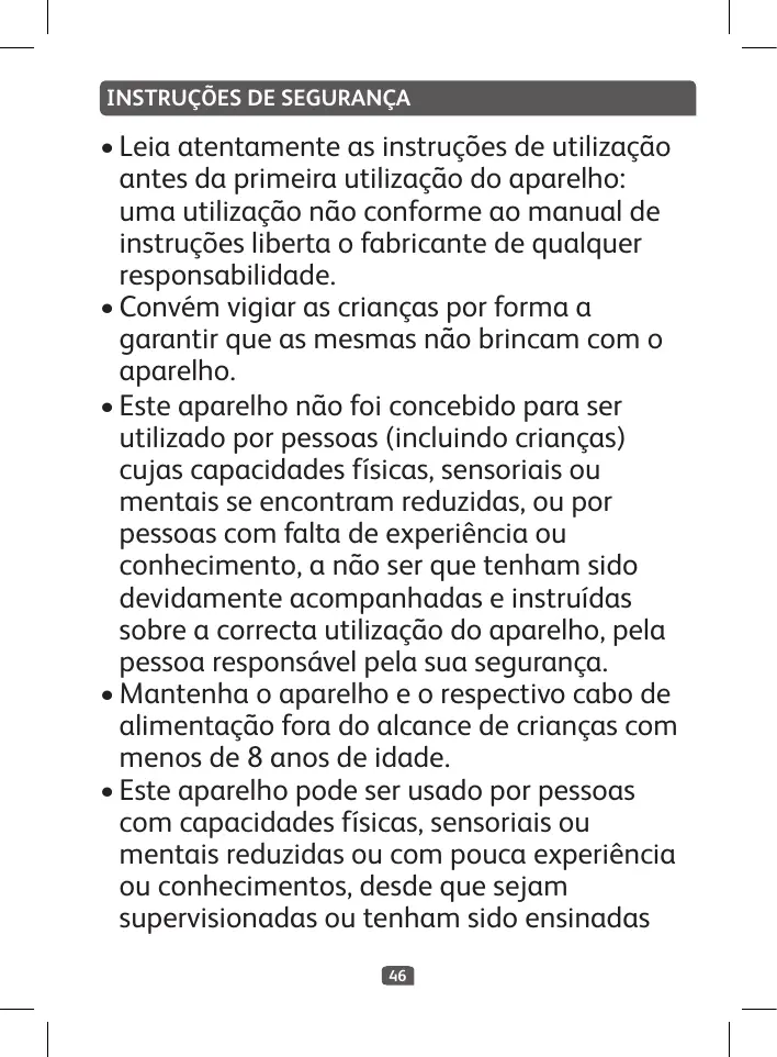 • Leia atentamente as instruções de utilização antes da primeira utilização do aparelho: uma utilização não conforme ao manual de instruções liberta o fabricante de qualquer responsabilidade. • Convém vigiar as crianças por forma a garantir que as mesmas não brincam com o aparelho. • Este aparelho não foi concebido para ser utilizado por pessoas (incluindo crianças) cujas capacidades físicas, sensoriais ou mentais se encontram reduzidas, ou por pessoas com falta de experiência ou conhecimento, a não ser que tenham sido devidamente acompanhadas e instruídas sobre a correcta utilização do aparelho, pela pessoa responsável pela sua segurança. • Mantenha o aparelho e o respectivo cabo de alimentação fora do alcance de crianças com menos de 8 anos de idade. • Este aparelho pode ser usado por pessoas com capacidades físicas, sensoriais ou mentais reduzidas ou com pouca experiência ou conhecimentos, desde que sejam supervisionadas ou tenham sido ensinadas 46