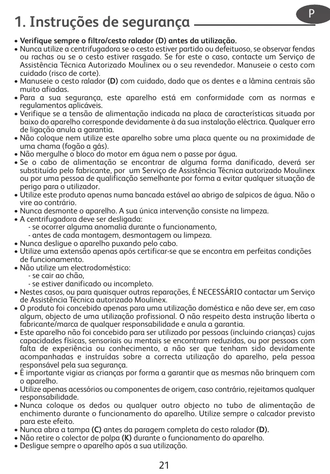 - Nunca utilize a centrifugadora se o cesto estiver partido ou defeituoso, se observar fendas ou rachas ou se o cesto estiver rasgado. Se for este o caso, contacte um Serviço de Assistência Técnica Autorizado Moulinex ou o seu revendedor. Manuseie o cesto com cuidado (risco de corte).