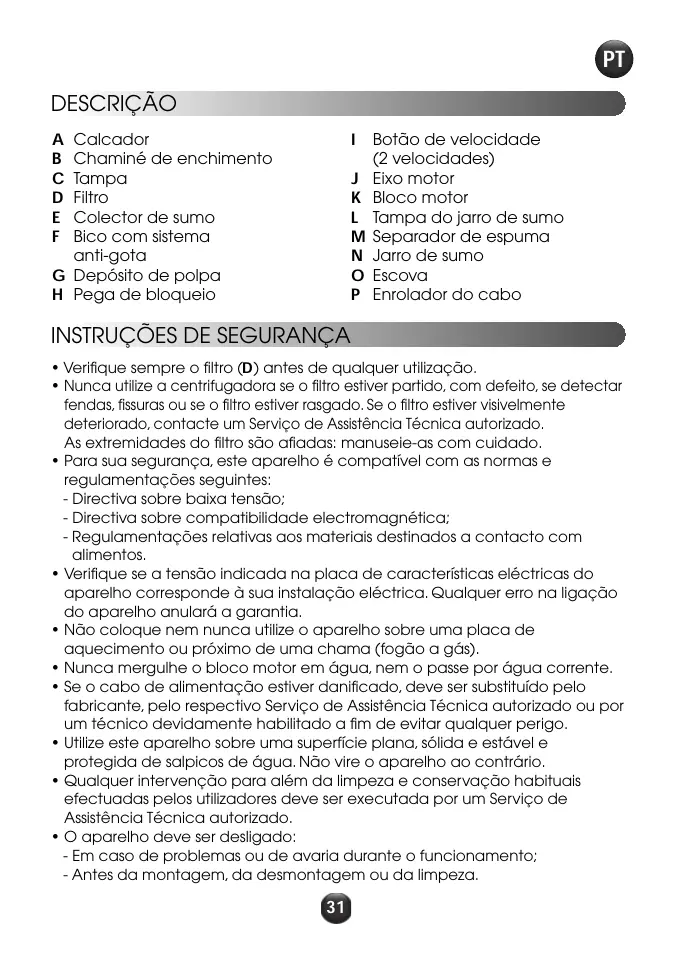 (D) O filtro não está bem posicionado. Verifique se o filtro está correctamente fixado no eixo motor A quantidade de fruta ou de legumes processados é excessiva. Deixe o aparelho arrefecer e reduza as quantidades de fruta ou de legumes a processar. O filtro (D) está obstruído. (J). Desligue o aparelho, limpe a chaminé e o filtro