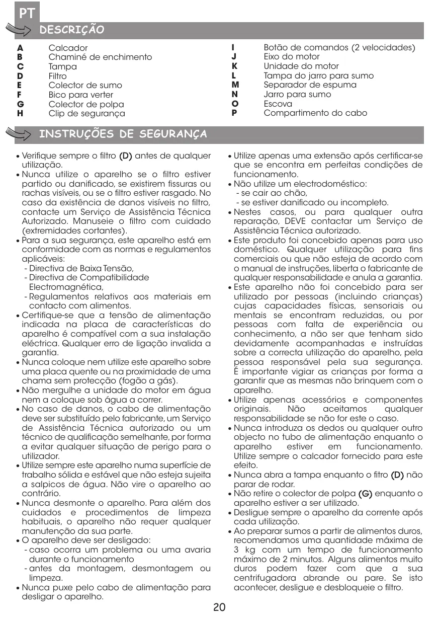 - Não retire o colector de polpa (G) enquanto o aparelho estiver a ser utilizado.