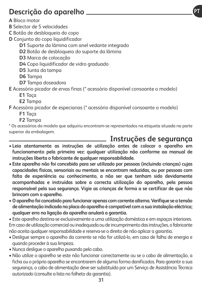 - Directives Basse Tension • Toute intervention, autre que le nettoyage et l'entretien usuel par le client, doit être effectuée par un centre service agréé. • Pour votre sécurité, n'utilisez que des accessoires et des pièces de rechange fournis par les centres service agréés. Attention : aucun accessoire ne pourra vous être vendu sans présentation de votre notice d’utilisation ou de votre appareil. • Ne mettez pas l'appareil, le câble d'alimentation ou la fiche dans du liquide. • Ne laissez pas le câble d'alimentation pendre à portée de mains des enfants, être à proximité ou en contact avec les parties chaudes de l'appareil, près d'une source de chaleur ou sur un angle vif. • Ne passez pas les accessoires contenant du métal au micro-ondes. • Des précautions doivent être prises lors de la manipulation des couteaux affutés du bloc lames (D1), du moulin à fines herbes (E), du moulin à épices (F), lorsqu'on vide les bols et lors du nettoyage : ils sont extrêmement coupants. • Ne touchez jamais les pièces en mouvement lorsque l'appareil est en fonctionnement, attendez l'arrêt complet de l'appareil et des accessoires pour intervenir ou pour enlever ces accessoires. • N'introduisez jamais d'ustensiles de cuisine (cuillère, spatule...) dans le bol (D) pendant le fonctionnement. • Ne laissez pas pendre les cheveux longs, écharpes, cravates etc.… au dessus de l'appareil ou des accessoires en fonctionnement. • Ne faites pas fonctionner le bol blender sans ingrédient, avec des produits secs uniquement ou durs (tels que des morceaux de sucre...), avec du liquide bouillant (supérieur à 80°C/176°F) ou si le couvercle (D6) équipé du joint (D5) n'est pas en place sur le bol (D). • Ne faites pas fonctionner votre appareil sans surveillance. • Versez toujours les ingrédients liquides en premier dans le bol blender avant d'ajouter les ingrédients solides, sans dépasser le niveau maximal. • Ne pas utiliser les bols comme récipients (congélation, cuisson, stérilisation). • N'utilisez pas votre appareil plus de 3 minutes en marche continue. • Placez l'appareil sur un plan de travail stable, résistant à la chaleur, propre et sec. • N'utilisez jamais cet appareil pour mélanger ou mixer des ingrédients non alimentaires.