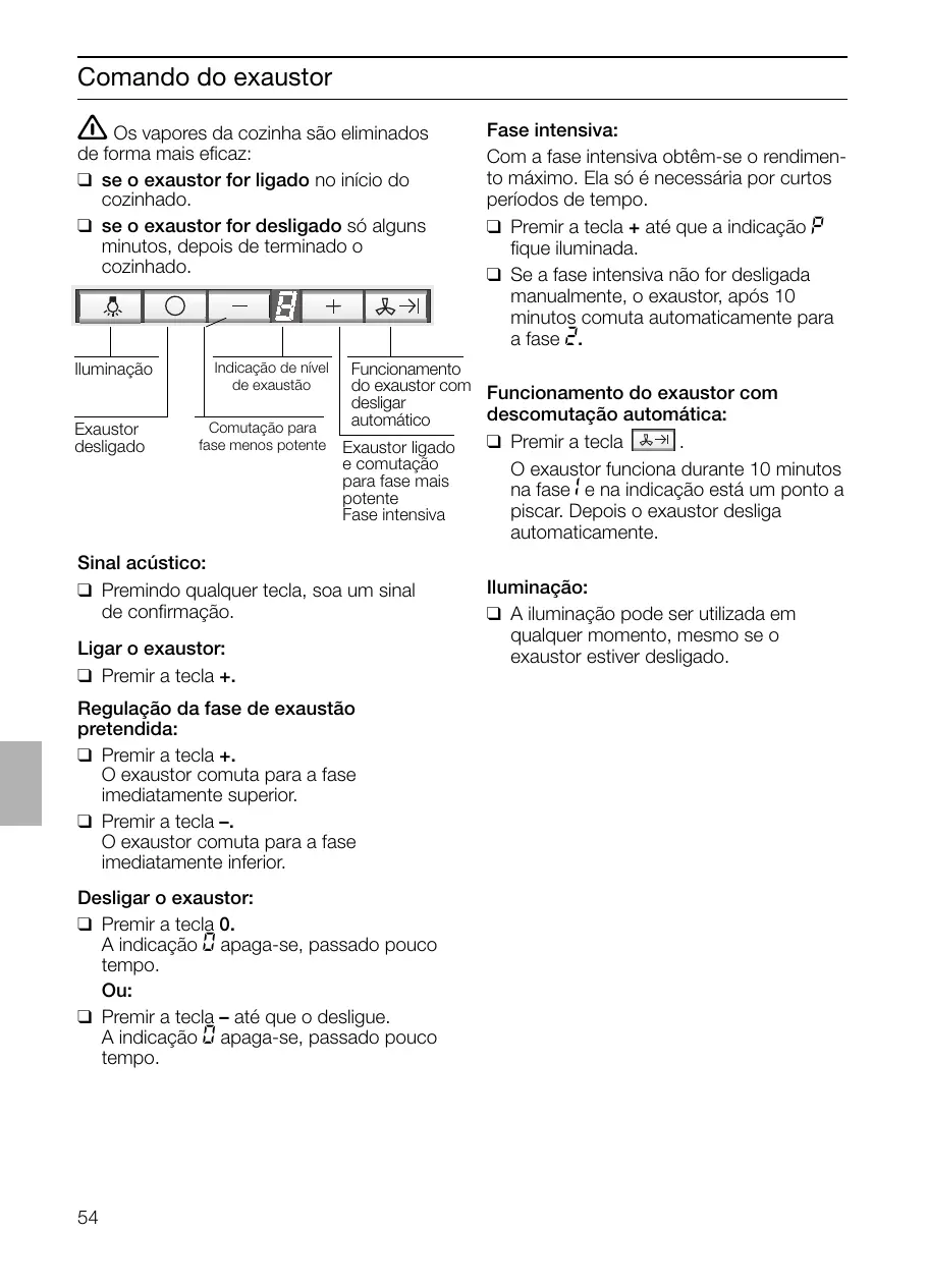 Os vapores da cozinha são eliminados de forma mais eficaz: ❑ se o exaustor for ligado no início do cozinhado. ❑ se o exaustor for desligado só alguns minutos, depois de terminado o cozinhado. Iluminação Exaustor desligado Indicação de nível de exaustão Comutação para fase menos potente Funcionamento do exaustor com Funcionamento do exaustor com desligar descomutação automática: automático Exaustor ligado e comutação para fase mais potente Fase intensiva Sinal acústico: ❑ Premindo qualquer tecla, soa um sinal de confirmação. Ligar o exaustor: ❑ Premir a tecla +. Regulação da fase de exaustão pretendida: ❑ Premir a tecla +. O exaustor comuta para a fase imediatamente superior. ❑ Premir a tecla –. O exaustor comuta para a fase imediatamente inferior. Desligar o exaustor: ❑ Premir a tecla 0. A indicação { apaga-se, passado pouco tempo. Ou: ❑ Premir a tecla – até que o desligue. A indicação { apaga-se, passado pouco tempo.