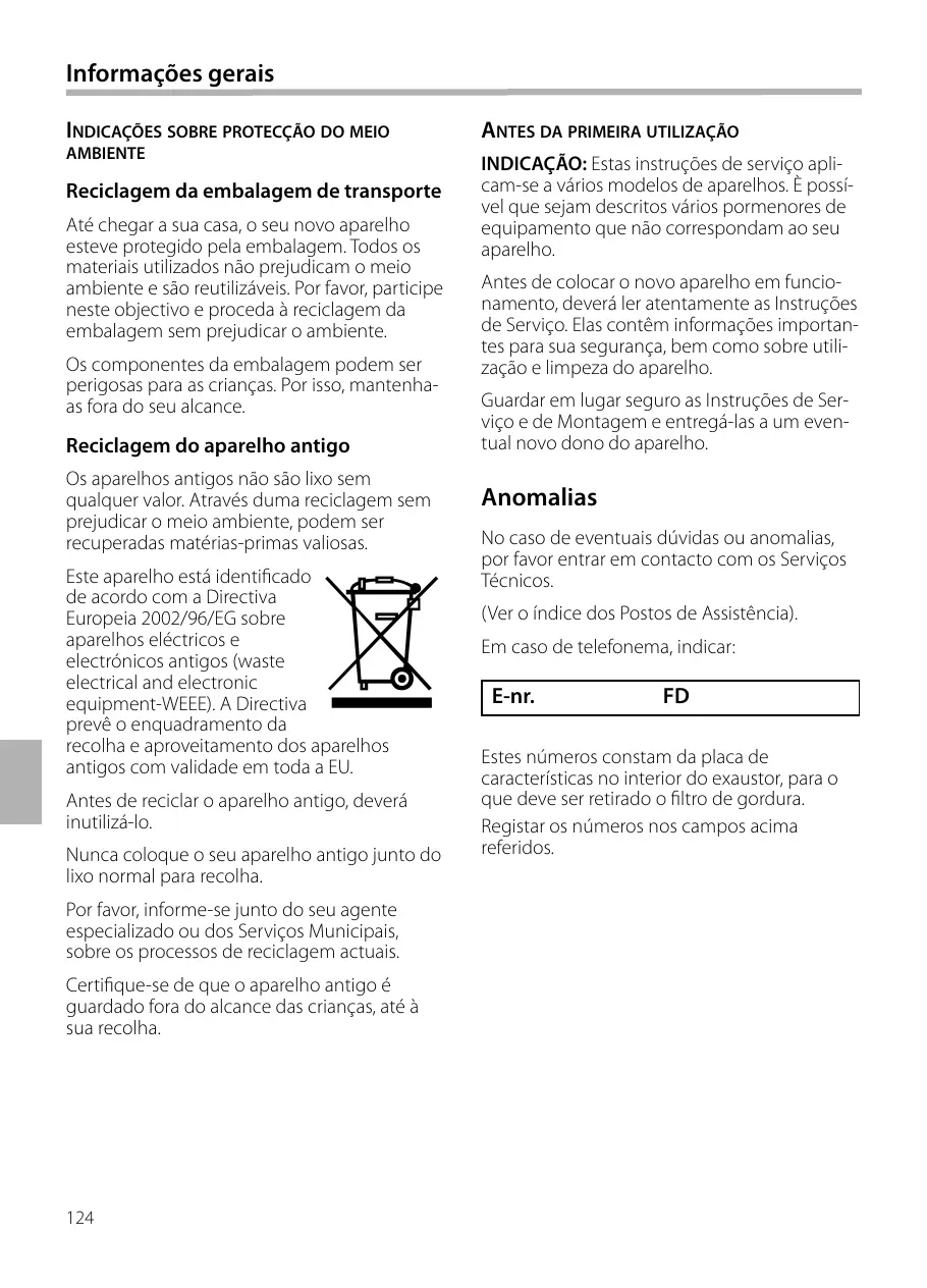 Informações gerais INDICAÇÕES SOBRE PROTECÇÃO DO MEIO AMBIENTE Reciclagem da embalagem de transporte Até chegar a sua casa, o seu novo aparelho esteve protegido pela embalagem. Todos os materiais utilizados não prejudicam o meio ambiente e são reutilizáveis. Por favor, participe neste objectivo e proceda à reciclagem da embalagem sem prejudicar o ambiente. Os componentes da embalagem podem ser perigosas para as crianças. Por isso, mantenhaas fora do seu alcance.