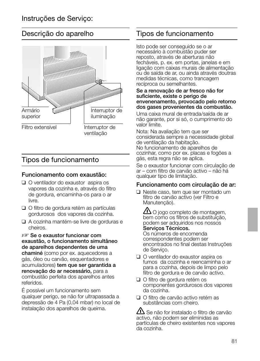 (véanse las instrucciones de uso del aparato). Atención: La campana extractora puede revestirse estando instalada en el interior del armario (por ejemplo con elementos de aglomerado de viruta). En tal caso hay que tener en cuenta los puntos siguientes: – El entrepaño del armario no debe asentarse directamente sobre el cuerpo de la campana extractora. – No fijar el revestimiento frontal en el cuerpo del aparato. – Prever el libre acceso al aparato para el personal del Servicio de Asistencia Técnica. Desmontaje: El desmontaje se efectúa en el orden inverso al mostrado para el montaje. Atención: En caso de funcionamiento con evacuación del aire al interior hay que desmontar el filtro de carbón filtro, y los soportes de plástico, a fin de poder acceder a los tornillos de fijación y a los soportes de montaje. Instruções de Serviço: Descrição do aparelho Armário superior Filtro extensível Interruptor de iluminação Interruptor de ventilação Tipos de funcionamento Funcionamento com exaustão: ❑ O ventilador do exaustor aspira os vapores da cozinha e, através do filtro de gordura, encaminha-os para o ar livre. ❑ O filtro de gordura retém as partículas gordurosos dos vapores da cozinha. ❑ A cozinha mantém-se livre de gorduras e cheiros. D Se o exaustor funcionar com exaustão, o funcionamento simultâneo de aparelhos dependentes de uma chaminé (como por ex. aquecedores a gás, óleo ou carvão, esquentadores e acumuladores) tem que ser garantida a renovação do ar necessário, para a combustão perfeita dos aparelhos antes referidos. É possível um funcionamento sem qualquer perigo, se não for ultrapassada a depressão de 4 Pa (0,04 mbar) no local de instalação dos aparelhos de queima. Tipos de funcionamento Isto pode ser conseguido se o ar necessário à combustão puder ser reposto, através de aberturas não fecháveis, p. ex. em portas, janelas e em ligação com caixas murais de alimentação ou de saída de ar, ou ainda através doutras medidas técnicas, como trancagem recíproca ou semelhantes. Se a renovação de ar fresco não for suficiente, existe o perigo de envenenamento, provocado pelo retorno dos gases provenientes da combustão. Uma caixa mural de entrada/saída de ar não garante, por si só, o cumprimento do valor limite. Nota: Na avaliação tem que ser considerada sempre a necessidade global de ventilação da habitação. No funcionamento de aparelhos de cozinhar, como por ex. placas e fogões a gás, esta regra não se aplica. Se o exaustor funcionar com circulação de ar – com filtro de carvão activo – não há qualquer tipo de limitação. Funcionamento com circulação de ar: ❑ Neste caso, tem que ser montado um filtro de carvão activo (ver Filtro e Manutenção). 몇 O jogo completo de montagem, bem como os filtros de substituição, podem ser adquiridos nos nossos Serviços Técnicos. Os números de encomenda correspondentes podem ser encontrados no final destas Instruções de Serviço. ❑ O ventilador do exaustor aspira os fumos da cozinha e reencaminha o ar para a cozinha, depois de limpo pelo filtro de gordura e de carvão activo. ❑ O filtro de gordura retém os componentes gordurosos dos vapores da cozinha. ❑ O filtro de carvão activo retém as substâncias com cheiro.