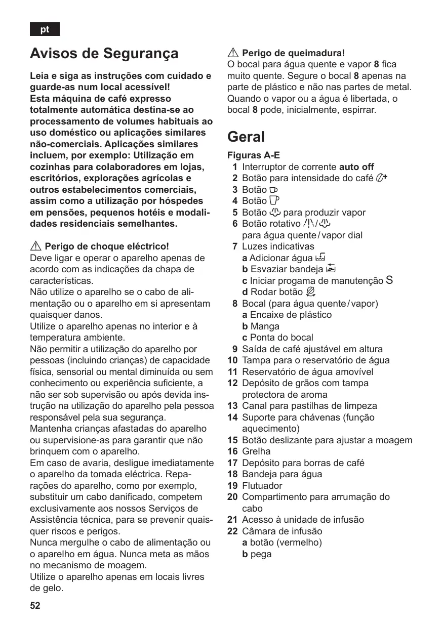 Figures A-E 13 Trémie pour pastilles de nettoyage 14 Plateau chauffe-tasses 15 Curseur de finesse de mouture du café 16 Grille 17 Tiroir à café 18 Bac collecteur d’eau 19 Flotteur 20 Logement pour le cordon électrique 21 Volet de la chambre de percolation 22 Chambre de percolation a Bouton-poussoir (rouge) b Poignée