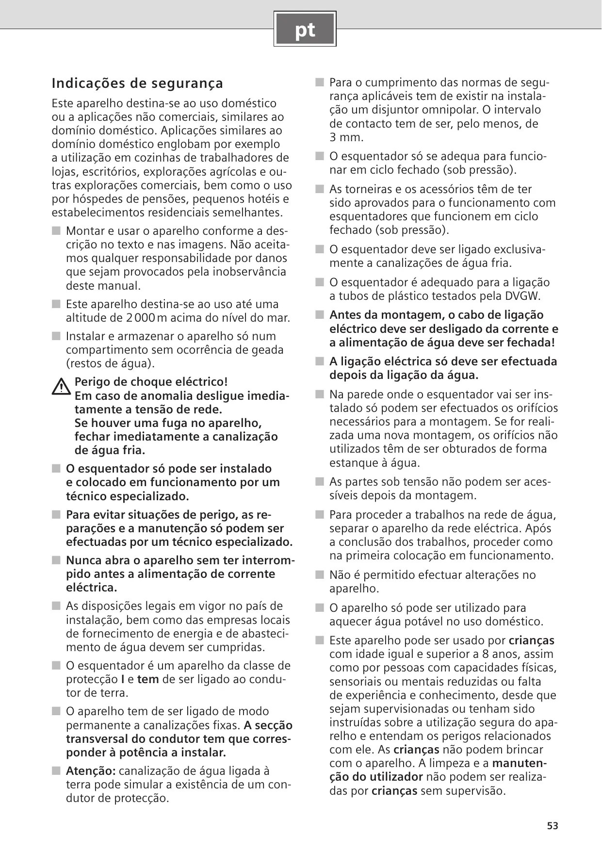 Indicações de segurança Este aparelho destina-se ao uso doméstico ou a aplicações não comerciais, similares ao domínio doméstico. Aplicações similares ao domínio doméstico englobam por exemplo a utilização em cozinhas de trabalhadores de lojas, escritórios, explorações agrícolas e outras explorações comerciais, bem como o uso por hóspedes de pensões, pequenos hotéis e estabelecimentos residenciais semelhantes. ■ Montar e usar o aparelho conforme a descrição no texto e nas imagens. Não aceitamos qualquer responsabilidade por danos que sejam provocados pela inobservância deste manual. ■ Este aparelho destina-se ao uso até uma altitude de 2 000 m acima do nível do mar. ■ Instalar e armazenar o aparelho só num compartimento sem ocorrência de geada (restos de água). Perigo de choque eléctrico! Em caso de anomalia desligue imediatamente a tensão de rede. Se houver uma fuga no aparelho, fechar imediatamente a canalização de água fria. ■ O esquentador só pode ser instalado e colocado em funcionamento por um técnico especializado. ■ Para evitar situações de perigo, as reparações e a manutenção só podem ser efectuadas por um técnico especializado. ■ Nunca abra o aparelho sem ter interrompido antes a alimentação de corrente eléctrica. ■ As disposições legais em vigor no país de instalação, bem como das empresas locais de fornecimento de energia e de abastecimento de água devem ser cumpridas. ■ O esquentador é um aparelho da classe de protecção I e tem de ser ligado ao condutor de terra. ■ O aparelho tem de ser ligado de modo permanente a canalizações fixas. A secção transversal do condutor tem que corresponder à potência a instalar. ■ Atenção: canalização de água ligada à terra pode simular a existência de um condutor de protecção. ■ Para o cumprimento das normas de segurança aplicáveis tem de existir na instalação um disjuntor omnipolar. O intervalo de contacto tem de ser, pelo menos, de 3 mm. ■ O esquentador só se adequa para funcionar em ciclo fechado (sob pressão). ■ As torneiras e os acessórios têm de ter sido aprovados para o funcionamento com esquentadores que funcionem em ciclo fechado (sob pressão). ■ O esquentador deve ser ligado exclusivamente a canalizações de água fria. ■ O esquentador é adequado para a ligação a tubos de plástico testados pela DVGW. ■ Antes da montagem, o cabo de ligação eléctrico deve ser desligado da corrente e a alimentação de água deve ser fechada! ■ A ligação eléctrica só deve ser efectuada depois da ligação da água. ■ Na parede onde o esquentador vai ser instalado só podem ser efectuados os orifícios necessários para a montagem. Se for realizada uma nova montagem, os orifícios não utilizados têm de ser obturados de forma estanque à água. ■ As partes sob tensão não podem ser acessíveis depois da montagem. ■ Para proceder a trabalhos na rede de água, separar o aparelho da rede eléctrica. Após a conclusão dos trabalhos, proceder como na primeira colocação em funcionamento. ■ Não é permitido efectuar alterações no aparelho. ■ O aparelho só pode ser utilizado para aquecer água potável no uso doméstico. ■ Este aparelho pode ser usado por crianças com idade igual e superior a 8 anos, assim como por pessoas com capacidades físicas, sensoriais ou mentais reduzidas ou falta de experiência e conhecimento, desde que sejam supervisionadas ou tenham sido instruídas sobre a utilização segura do aparelho e entendam os perigos relacionados com ele. As crianças não podem brincar com o aparelho. A limpeza e a manutenção do utilizador não podem ser realizadas por crianças sem supervisão.
