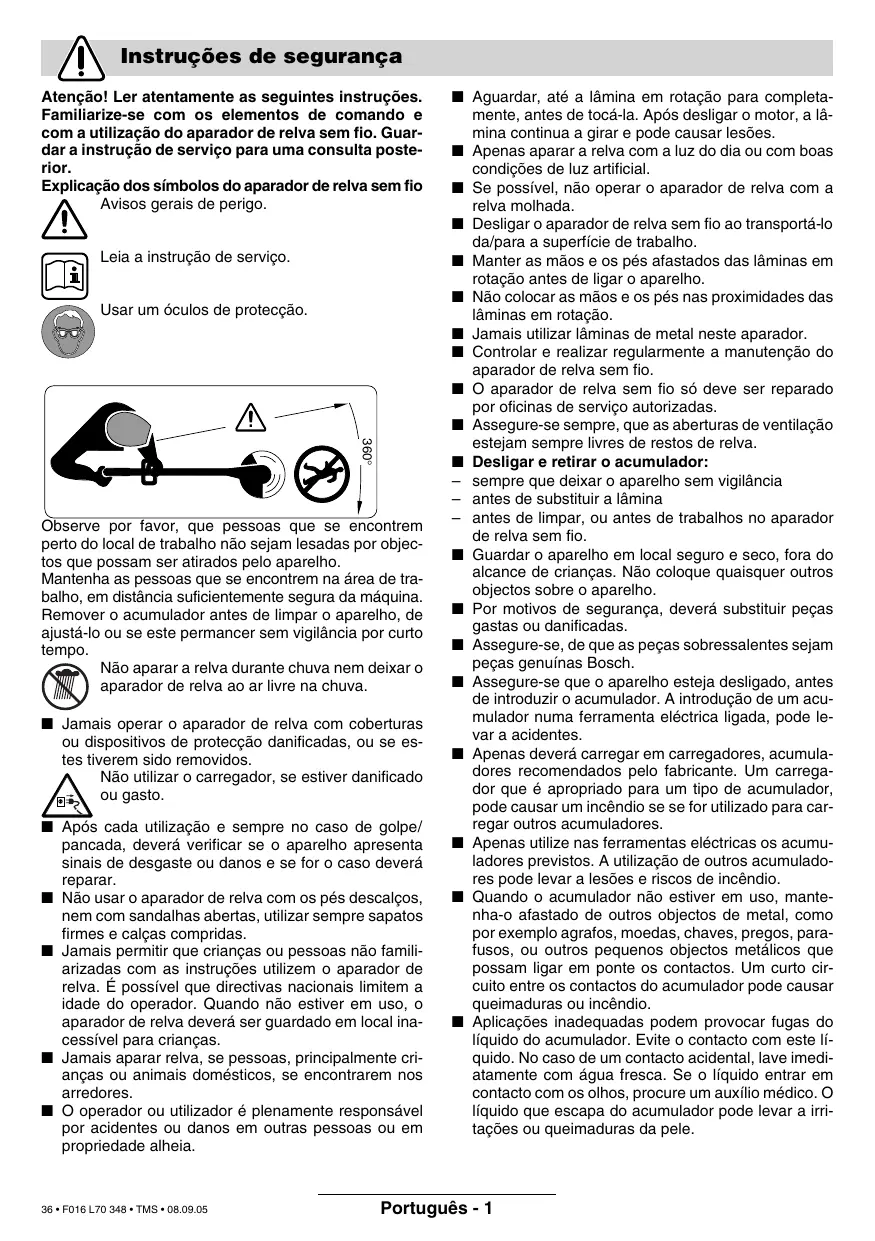 Observe por favor, que pessoas que se encontrem perto do local de trabalho não sejam lesadas por objectos que possam ser atirados pelo aparelho. Mantenha as pessoas que se encontrem na área de trabalho, em distância suficientemente segura da máquina. Remover o acumulador antes de limpar o aparelho, de ajustá-lo ou se este permancer sem vigilância por curto tempo. Não aparar a relva durante chuva nem deixar o aparador de relva ao ar livre na chuva. ■ Jamais operar o aparador de relva com coberturas ou dispositivos de protecção danificadas, ou se estes tiverem sido removidos. Não utilizar o carregador, se estiver danificado ou gasto. ■ Após cada utilização e sempre no caso de golpe/ pancada, deverá verificar se o aparelho apresenta sinais de desgaste ou danos e se for o caso deverá reparar. ■ Não usar o aparador de relva com os pés descalços, nem com sandalhas abertas, utilizar sempre sapatos firmes e calças compridas. ■ Jamais permitir que crianças ou pessoas não familiarizadas com as instruções utilizem o aparador de relva. É possível que directivas nacionais limitem a idade do operador. Quando não estiver em uso, o aparador de relva deverá ser guardado em local inacessível para crianças. ■ Jamais aparar relva, se pessoas, principalmente crianças ou animais domésticos, se encontrarem nos arredores. ■ O operador ou utilizador é plenamente responsável por acidentes ou danos em outras pessoas ou em propriedade alheia.