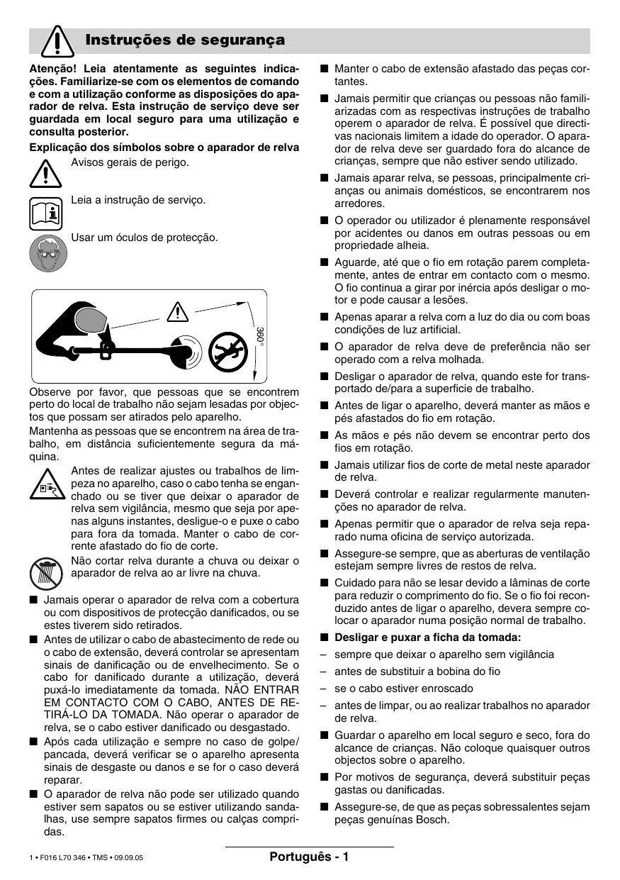 Dr. Eckerhard Strötgen Head of Product Certification Español - 7 Instruções de segurança Atenção! Leia atentamente as seguintes indicações. Familiarize-se com os elementos de comando e com a utilização conforme as disposições do aparador de relva. Esta instrução de serviço deve ser guardada em local seguro para uma utilização e consulta posterior. Explicação dos símbolos sobre o aparador de relva Avisos gerais de perigo. ■ Manter o cabo de extensão afastado das peças cortantes. ■ Jamais permitir que crianças ou pessoas não familiarizadas com as respectivas instruções de trabalho operem o aparador de relva. É possível que directivas nacionais limitem a idade do operador. O aparador de relva deve ser guardado fora do alcance de crianças, sempre que não estiver sendo utilizado. ■ Jamais aparar relva, se pessoas, principalmente crianças ou animais domésticos, se encontrarem nos arredores. Leia a instrução de serviço. ■ O operador ou utilizador é plenamente responsável por acidentes ou danos em outras pessoas ou em propriedade alheia. Usar um óculos de protecção. ■ Aguarde, até que o fio em rotação parem completamente, antes de entrar em contacto com o mesmo. O fio continua a girar por inércia após desligar o motor e pode causar a lesões. 360° ■ Apenas aparar a relva com a luz do dia ou com boas condições de luz artificial. ■ O aparador de relva deve de preferência não ser operado com a relva molhada. Observe por favor, que pessoas que se encontrem perto do local de trabalho não sejam lesadas por objectos que possam ser atirados pelo aparelho. Mantenha as pessoas que se encontrem na área de trabalho, em distância suficientemente segura da máquina. Antes de realizar ajustes ou trabalhos de limpeza no aparelho, caso o cabo tenha se enganchado ou se tiver que deixar o aparador de relva sem vigilância, mesmo que seja por apenas alguns instantes, desligue-o e puxe o cabo para fora da tomada. Manter o cabo de corrente afastado do fio de corte. Não cortar relva durante a chuva ou deixar o aparador de relva ao ar livre na chuva. ■ Jamais operar o aparador de relva com a cobertura ou com dispositivos de protecção danificados, ou se estes tiverem sido retirados. ■ Antes de utilizar o cabo de abastecimento de rede ou o cabo de extensão, deverá controlar se apresentam sinais de danificação ou de envelhecimento. Se o cabo for danificado durante a utilização, deverá puxá-lo imediatamente da tomada. NÃO ENTRAR EM CONTACTO COM O CABO, ANTES DE RETIRÁ-LO DA TOMADA. Não operar o aparador de relva, se o cabo estiver danificado ou desgastado. ■ Após cada utilização e sempre no caso de golpe/ pancada, deverá verificar se o aparelho apresenta sinais de desgaste ou danos e se for o caso deverá reparar. ■ O aparador de relva não pode ser utilizado quando estiver sem sapatos ou se estiver utilizando sandalhas, use sempre sapatos firmes ou calças compridas.