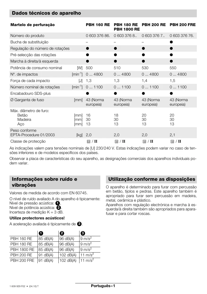 Encabadouro SDS-plus Ø Garganta de fuso Máx. diâmetro de furo: Betão Madeira Aço Peso conforme EPTA-Procedure 01/2003 [kg] 2,0 Classe de protecção 2,0 / II 2,0 / II 2,1 / II / II As indicações valem para tensões nominais de [U] 230/240 V. Estas indicações podem variar no caso de tensões inferiores e de modelos específicos dos países. Observar a placa de características do seu aparelho, as designações comerciais dos aparelhos individuais podem variar. Informações sobre ruído e vibrações Utilização conforme as disposições Valores de medida de acordo com EN 60745. O nível de ruído avaliado A do aparelho é tipicamente: Nível de pressão acústica: 1 , Nível de potência acústica: 2 . Incerteza de medição K = 3 dB. Utilize protectores acústicos! A aceleração avaliada é tipicamente de 3 .