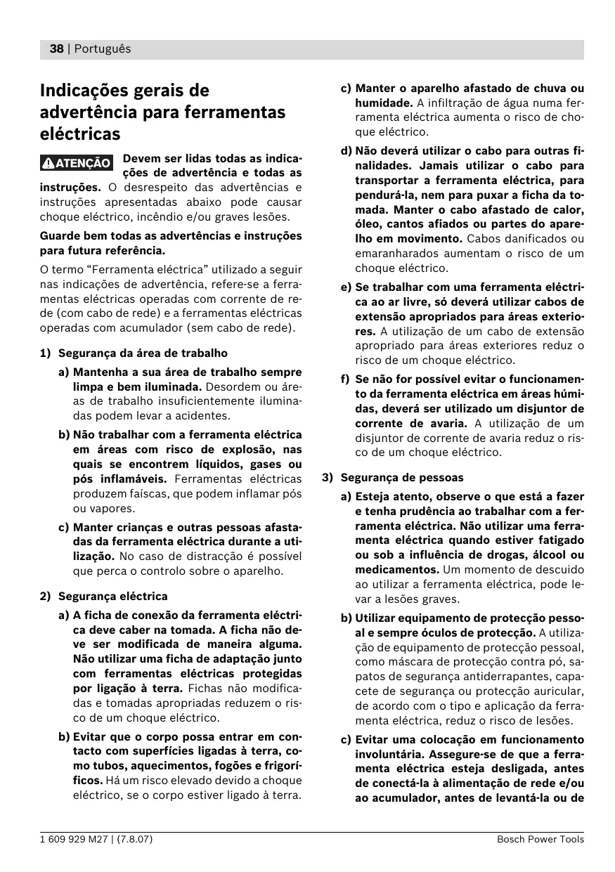 a) Esteja atento, observe o que está a fazer e tenha prudência ao trabalhar com a ferramenta eléctrica. Não utilizar uma ferramenta eléctrica quando estiver fatigado ou sob a influência de drogas, álcool ou medicamentos. Um momento de descuido ao utilizar a ferramenta eléctrica, pode levar a lesões graves. a) A ficha de conexão da ferramenta eléctrica deve caber na tomada. A ficha não deve ser modificada de maneira alguma. Não utilizar uma ficha de adaptação junto com ferramentas eléctricas protegidas por ligação à terra. Fichas não modificadas e tomadas apropriadas reduzem o risco de um choque eléctrico. b) Utilizar equipamento de protecção pessoal e sempre óculos de protecção. A utilização de equipamento de protecção pessoal, como máscara de protecção contra pó, sapatos de segurança antiderrapantes, capacete de segurança ou protecção auricular, de acordo com o tipo e aplicação da ferramenta eléctrica, reduz o risco de lesões. b) Evitar que o corpo possa entrar em contacto com superfícies ligadas à terra, como tubos, aquecimentos, fogões e frigoríficos. Há um risco elevado devido a choque eléctrico, se o corpo estiver ligado à terra. c) Evitar uma colocação em funcionamento involuntária. Assegure-se de que a ferramenta eléctrica esteja desligada, antes de conectá-la à alimentação de rede e/ou ao acumulador, antes de levantá-la ou de 1 609 929 M27 | (7.8.07) Bosch Power Tools Português | 39 transportá-la. Se tiver o dedo no interruptor ao transportar a ferramenta eléctrica ou se o aparelho for conectado à alimentação de rede enquanto estiver ligado, poderão ocorrer acidentes. d) Remover ferramentas de ajuste ou chaves de boca antes de ligar a ferramenta eléctrica. Uma ferramenta ou chave que se encontre numa parte do aparelho em movimento pode levar a lesões. e) Evite uma posição anormal. Mantenha uma posição firme e mantenha sempre o equilíbrio. Desta forma é mais fácil controlar a ferramenta eléctrica em situações inesperadas. f) Usar roupa apropriada. Não usar roupa larga nem jóias. Mantenha os cabelos, roupas e luvas afastadas de partes em movimento. Roupas frouxas, cabelos longos ou jóias podem ser agarrados por peças em movimento. g) Se for possível montar dispositivos de aspiração ou de recolha, assegure-se de que estejam conectados e utilizados correctamente. A utilização de uma aspiração de pó pode reduzir o perigo devido ao pó.