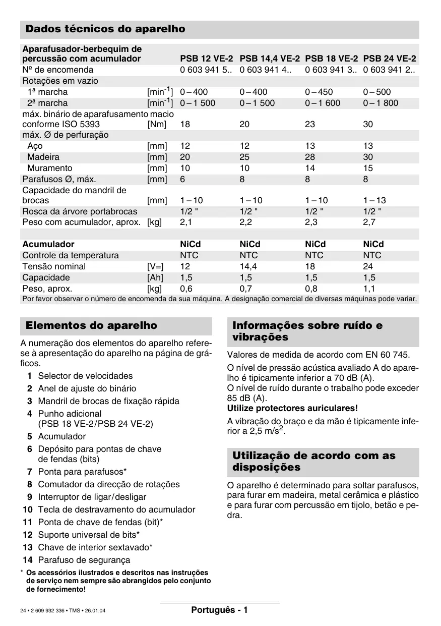 1 – 10 1/2 " 2,1 1 – 10 1/2 " 2,2 1 – 10 1/2 " 2,3 1 – 13 1/2 " 2,7 NiCd NTC 1,5 0,6 NiCd NTC 14,4 1,5 0,7 NiCd NTC 1,5 0,8 NiCd NTC 1,5 1,1 Por favor observar o número de encomenda da sua máquina. A designação comercial de diversas máquinas pode variar. Elementos do aparelho A numeração dos elementos do aparelho referese à apresentação do aparelho na página de gráficos. 1 Selector de velocidades 2 Anel de ajuste do binário 3 Mandril de brocas de fixação rápida 4 Punho adicional (PSB 18 VE-2/PSB 24 VE-2) 5 Acumulador 6 Depósito para pontas de chave de fendas (bits) 7 Ponta para parafusos* 8 Comutador da direcção de rotações 9 Interruptor de ligar/desligar 10 Tecla de destravamento do acumulador 11 Ponta de chave de fendas (bit)* 12 Suporte universal de bits* 13 Chave de interior sextavado* 14 Parafuso de segurança Informações sobre ruído e vibrações Valores de medida de acordo com EN 60 745. O nível de pressão acústica avaliado A do aparelho é tipicamente inferior a 70 dB (A). O nível de ruído durante o trabalho pode exceder 85 dB (A). Utilize protectores auriculares! A vibração do braço e da mão é tipicamente inferior a 2,5 m/s2. Utilização de acordo com as disposições O aparelho é determinado para soltar parafusos, para furar em madeira, metal cerâmica e plástico e para furar com percussão em tijolo, betão e pedra.