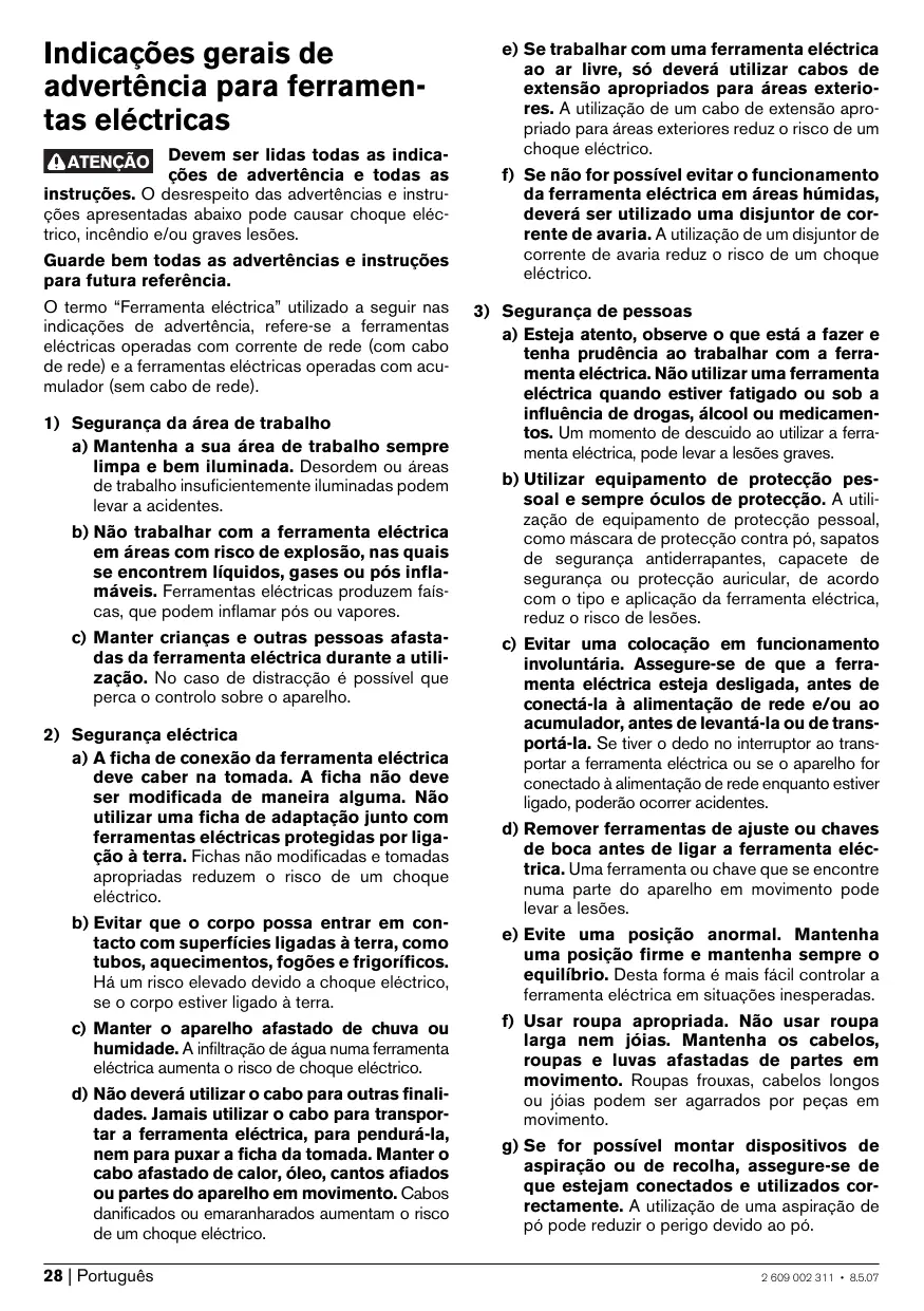 a) Esteja atento, observe o que está a fazer e tenha prudência ao trabalhar com a ferramenta eléctrica. Não utilizar uma ferramenta eléctrica quando estiver fatigado ou sob a influência de drogas, álcool ou medicamentos. Um momento de descuido ao utilizar a ferramenta eléctrica, pode levar a lesões graves. b) Utilizar equipamento de protecção pessoal e sempre óculos de protecção. A utilização de equipamento de protecção pessoal, como máscara de protecção contra pó, sapatos de segurança antiderrapantes, capacete de segurança ou protecção auricular, de acordo com o tipo e aplicação da ferramenta eléctrica, reduz o risco de lesões. c) Evitar uma colocação em funcionamento involuntária. Assegure-se de que a ferramenta eléctrica esteja desligada, antes de conectá-la à alimentação de rede e/ou ao acumulador, antes de levantá-la ou de transportá-la. Se tiver o dedo no interruptor ao transportar a ferramenta eléctrica ou se o aparelho for conectado à alimentação de rede enquanto estiver ligado, poderão ocorrer acidentes. d) Remover ferramentas de ajuste ou chaves de boca antes de ligar a ferramenta eléctrica. Uma ferramenta ou chave que se encontre numa parte do aparelho em movimento pode levar a lesões. e) Evite uma posição anormal. Mantenha uma posição firme e mantenha sempre o equilíbrio. Desta forma é mais fácil controlar a ferramenta eléctrica em situações inesperadas. f) Usar roupa apropriada. Não usar roupa larga nem jóias. Mantenha os cabelos, roupas e luvas afastadas de partes em movimento. Roupas frouxas, cabelos longos ou jóias podem ser agarrados por peças em movimento. g) Se for possível montar dispositivos de aspiração ou de recolha, assegure-se de que estejam conectados e utilizados correctamente. A utilização de uma aspiração de pó pode reduzir o perigo devido ao pó. 2 609 002 311 • 8.5.07