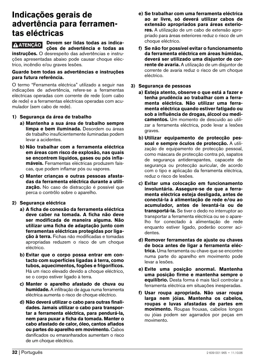 a) Não sobrecarregue o aparelho. Utilize a ferramenta eléctrica apropriada para o seu trabalho. É melhor e mais seguro trabalhar com a ferramenta eléctrica apropriada na área de potência indicada. b) Não utilizar uma ferramenta eléctrica com um interruptor defeituoso. Uma ferramenta eléctrica que não pode mais ser ligada nem desligada, é perigosa e deve ser reparada. c) Puxar a ficha da tomada e/ou remover o acumulador antes de executar ajustes no aparelho, de substituir acessórios ou de guardar o aparelho. Esta medida de segurança evita o arranque involuntário da ferramenta eléctrica. d) Guardar ferramentas eléctricas não utilizadas fora do alcance de crianças. Não permita que pessoas que não estejam familiarizadas com o aparelho ou que não tenham lido estas instruções, utilizem o aparelho. Ferramentas eléctricas são perigosas se forem utilizadas por pessoas inesperientes. e) Tratar a ferramenta eléctrica com cuidado. Controlar se as partes móveis do aparelho funcionam perfeitamente e não emperram, e se há peças quebradas ou danificadas que possam prejudicar o funcionamento da ferramenta eléctrica. Permitir que peças danificadas sejam reparadas antes da utilização. Muitos acidentes têm como causa, a manutenção insuficiente de ferramentas eléctricas. f) Manter as ferramentas de corte afiadas e limpas. Ferramentas de corte cuidadosamente tratadas e com cantos de corte afiados emperram com menos frequência e podem ser conduzidas com maior facilidade. g) Utilizar a ferramenta eléctrica, acessórios, ferramentas de aplicação, etc. conforme estas instruções. Considerar as condições de trabalho e a tarefa a ser executada. A utilização de ferramentas eléctricas para outras tarefas a não ser as aplicações previstas, pode levar a situações perigosas. 2 609 001 965 • 11.10.06