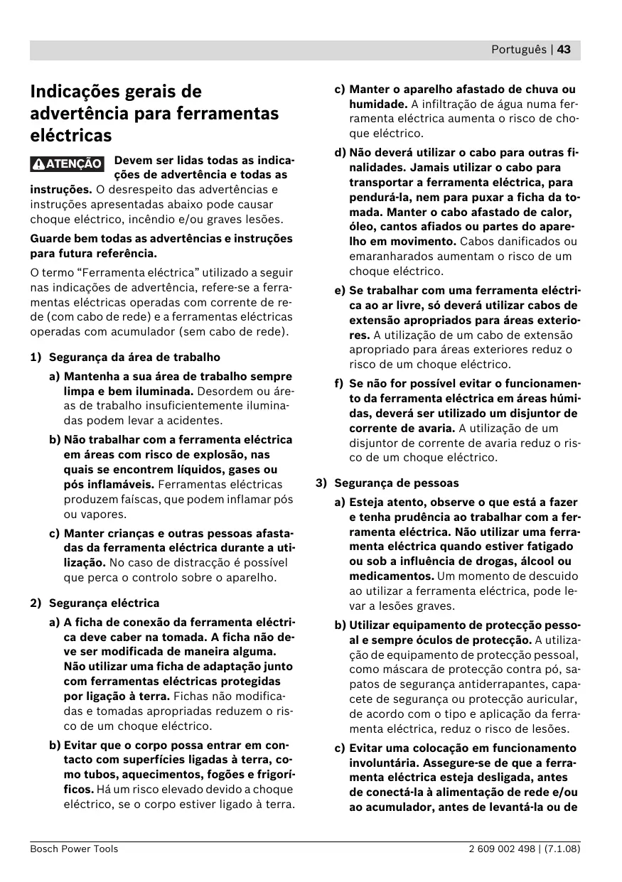 a) Esteja atento, observe o que está a fazer e tenha prudência ao trabalhar com a ferramenta eléctrica. Não utilizar uma ferramenta eléctrica quando estiver fatigado ou sob a influência de drogas, álcool ou medicamentos. Um momento de descuido ao utilizar a ferramenta eléctrica, pode levar a lesões graves. a) A ficha de conexão da ferramenta eléctrica deve caber na tomada. A ficha não deve ser modificada de maneira alguma. Não utilizar uma ficha de adaptação junto com ferramentas eléctricas protegidas por ligação à terra. Fichas não modificadas e tomadas apropriadas reduzem o risco de um choque eléctrico. b) Utilizar equipamento de protecção pessoal e sempre óculos de protecção. A utilização de equipamento de protecção pessoal, como máscara de protecção contra pó, sapatos de segurança antiderrapantes, capacete de segurança ou protecção auricular, de acordo com o tipo e aplicação da ferramenta eléctrica, reduz o risco de lesões. b) Evitar que o corpo possa entrar em contacto com superfícies ligadas à terra, como tubos, aquecimentos, fogões e frigoríficos. Há um risco elevado devido a choque eléctrico, se o corpo estiver ligado à terra. c) Evitar uma colocação em funcionamento involuntária. Assegure-se de que a ferramenta eléctrica esteja desligada, antes de conectá-la à alimentação de rede e/ou ao acumulador, antes de levantá-la ou de Bosch Power Tools 2 609 002 498 | (7.1.08) 44 | Português transportá-la. Se tiver o dedo no interruptor ao transportar a ferramenta eléctrica ou se o aparelho for conectado à alimentação de rede enquanto estiver ligado, poderão ocorrer acidentes. d) Remover ferramentas de ajuste ou chaves de boca antes de ligar a ferramenta eléctrica. Uma ferramenta ou chave que se encontre numa parte do aparelho em movimento pode levar a lesões. e) Evite uma posição anormal. Mantenha uma posição firme e mantenha sempre o equilíbrio. Desta forma é mais fácil controlar a ferramenta eléctrica em situações inesperadas. f) Usar roupa apropriada. Não usar roupa larga nem jóias. Mantenha os cabelos, roupas e luvas afastadas de partes em movimento. Roupas frouxas, cabelos longos ou jóias podem ser agarrados por peças em movimento. g) Se for possível montar dispositivos de aspiração ou de recolha, assegure-se de que estejam conectados e utilizados correctamente. A utilização de uma aspiração de pó pode reduzir o perigo devido ao pó.