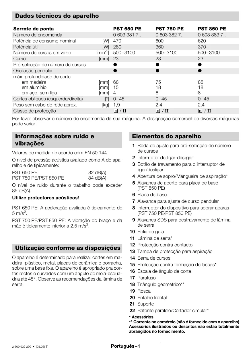 84 dB(A) O nível de ruído durante o trabalho pode exceder 85 dB(A). Utilize protectores acústicos! PST 650 PE: A aceleração avaliada é tipicamente de 5 m/s2. PST 750 PE/PST 850 PE: A vibração do braço e da mão é tipicamente inferior a 2,5 m/s2. Utilização conforme as disposições O aparelho é determinado para realizar cortes em madeira, plástico, metal, placas de cerâmica e borracha, sobre uma base fixa. O aparelho é apropriado pra cortes rectos e curvados com um ângulo de meia-esquadria até 45°. Observe as recomendações da lâmina de serra. 1 Roda de ajuste para pré-selecção de número de cursos 2 Interruptor de ligar-desligar 3 Botão de travamento para o interruptor de ligar/desligar 4 Abertura de sopro/Mangueira de aspiração* 5 Alavanca de aperto para placa de base (PST 850 PE) 6 Placa de base 7 Alavanca para ajuste de curso pendular 8 Interruptor do dispositivo para soprar aparas (PST 750 PE/PST 850 PE) 9 Alavanca SDS para destravamento de lâmina de serra 10 Polia de guia 11 Lâmina de serra* 12 Protecção contra contacto 13 Tampa de protecção para aspiração 14 Barra de cursos 15 Protecção contra formação de lascas* 16 Escala de ângulo de corte 17 Parafuso 18 Triângulo geométrico** 19 Rosca 20 Entalhe frontal 21 Suporte 22 Batente paralelo/Cortador circular*