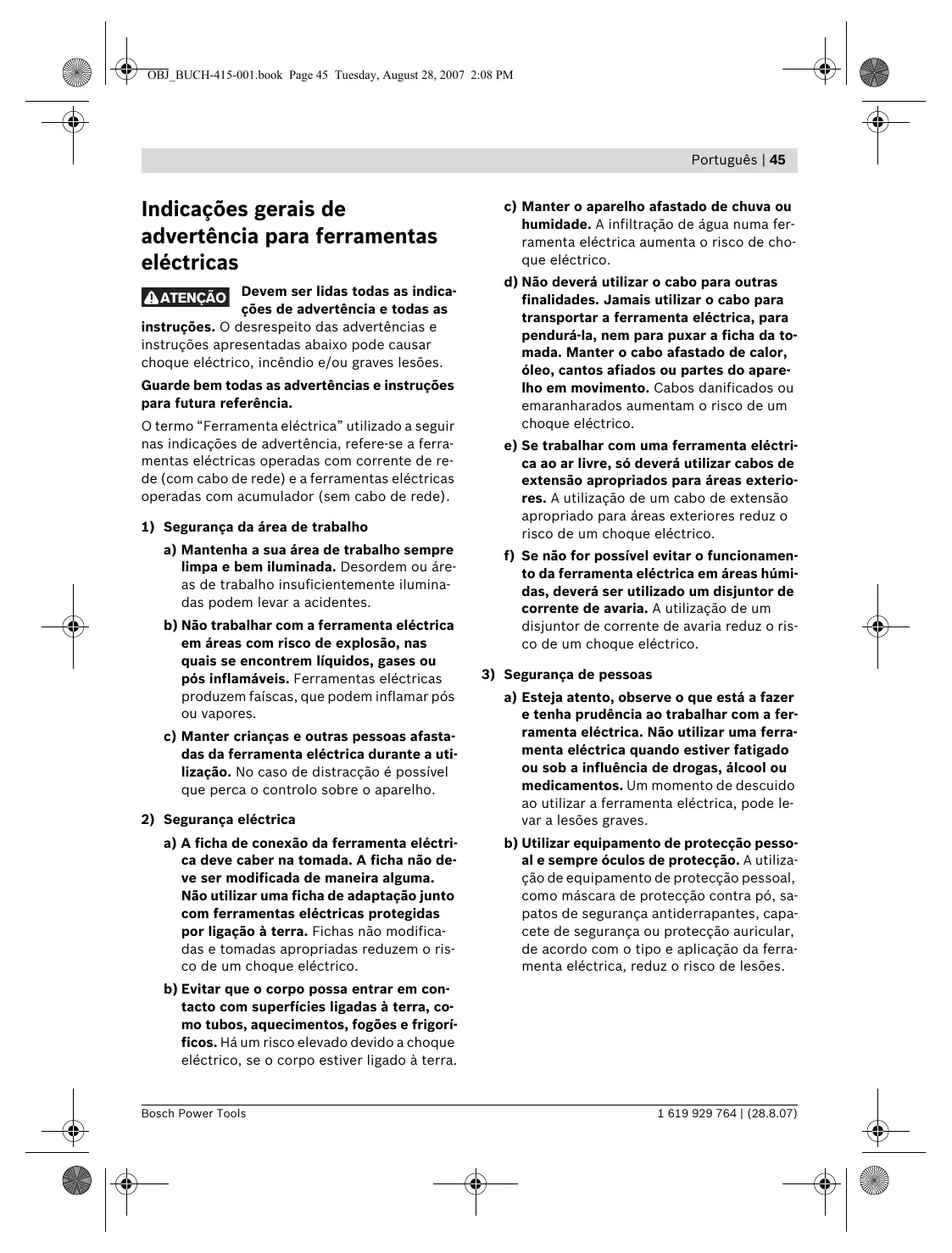 a) Esteja atento, observe o que está a fazer e tenha prudência ao trabalhar com a ferramenta eléctrica. Não utilizar uma ferramenta eléctrica quando estiver fatigado ou sob a influência de drogas, álcool ou medicamentos. Um momento de descuido ao utilizar a ferramenta eléctrica, pode levar a lesões graves. b) Utilizar equipamento de protecção pessoal e sempre óculos de protecção. A utilização de equipamento de protecção pessoal, como máscara de protecção contra pó, sapatos de segurança antiderrapantes, capacete de segurança ou protecção auricular, de acordo com o tipo e aplicação da ferramenta eléctrica, reduz o risco de lesões. b) Evitar que o corpo possa entrar em contacto com superfícies ligadas à terra, como tubos, aquecimentos, fogões e frigoríficos. Há um risco elevado devido a choque eléctrico, se o corpo estiver ligado à terra. Bosch Power Tools 1 619 929 764 | (28.8.07) OBJ_BUCH-415-001.book Page 46 Tuesday, August 28, 2007 2:08 PM 46 | Português c) Evitar uma colocação em funcionamento involuntária. Assegure-se de que a ferramenta eléctrica esteja desligada, antes de conectá-la à alimentação de rede e/ou ao acumulador, antes de levantá-la ou de transportá-la. Se tiver o dedo no interruptor ao transportar a ferramenta eléctrica ou se o aparelho for conectado à alimentação de rede enquanto estiver ligado, poderão ocorrer acidentes. d) Remover ferramentas de ajuste ou chaves de boca antes de ligar a ferramenta eléctrica. Uma ferramenta ou chave que se encontre numa parte do aparelho em movimento pode levar a lesões. e) Evite uma posição anormal. Mantenha uma posição firme e mantenha sempre o equilíbrio. Desta forma é mais fácil controlar a ferramenta eléctrica em situações inesperadas. f) Usar roupa apropriada. Não usar roupa larga nem jóias. Mantenha os cabelos, roupas e luvas afastadas de partes em movimento. Roupas frouxas, cabelos longos ou jóias podem ser agarrados por peças em movimento. g) Se for possível montar dispositivos de aspiração ou de recolha, assegure-se de que estejam conectados e utilizados correctamente. A utilização de uma aspiração de pó pode reduzir o perigo devido ao pó.