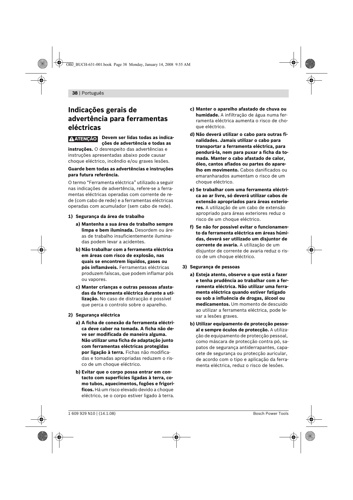 a) Esteja atento, observe o que está a fazer e tenha prudência ao trabalhar com a ferramenta eléctrica. Não utilizar uma ferramenta eléctrica quando estiver fatigado ou sob a influência de drogas, álcool ou medicamentos. Um momento de descuido ao utilizar a ferramenta eléctrica, pode levar a lesões graves. b) Utilizar equipamento de protecção pessoal e sempre óculos de protecção. A utilização de equipamento de protecção pessoal, como máscara de protecção contra pó, sapatos de segurança antiderrapantes, capacete de segurança ou protecção auricular, de acordo com o tipo e aplicação da ferramenta eléctrica, reduz o risco de lesões. b) Evitar que o corpo possa entrar em contacto com superfícies ligadas à terra, como tubos, aquecimentos, fogões e frigoríficos. Há um risco elevado devido a choque eléctrico, se o corpo estiver ligado à terra. 1 609 929 N10 | (14.1.08) Bosch Power Tools OBJ_BUCH-631-001.book Page 39 Monday, January 14, 2008 9:55 AM Português | 39 c) Evitar uma colocação em funcionamento involuntária. Assegure-se de que a ferramenta eléctrica esteja desligada, antes de conectá-la à alimentação de rede e/ou ao acumulador, antes de levantá-la ou de transportá-la. Se tiver o dedo no interruptor ao transportar a ferramenta eléctrica ou se o aparelho for conectado à alimentação de rede enquanto estiver ligado, poderão ocorrer acidentes. d) Remover ferramentas de ajuste ou chaves de boca antes de ligar a ferramenta eléctrica. Uma ferramenta ou chave que se encontre numa parte do aparelho em movimento pode levar a lesões. e) Evite uma posição anormal. Mantenha uma posição firme e mantenha sempre o equilíbrio. Desta forma é mais fácil controlar a ferramenta eléctrica em situações inesperadas. f) Usar roupa apropriada. Não usar roupa larga nem jóias. Mantenha os cabelos, roupas e luvas afastadas de partes em movimento. Roupas frouxas, cabelos longos ou jóias podem ser agarrados por peças em movimento. g) Se for possível montar dispositivos de aspiração ou de recolha, assegure-se de que estejam conectados e utilizados correctamente. A utilização de uma aspiração de pó pode reduzir o perigo devido ao pó.