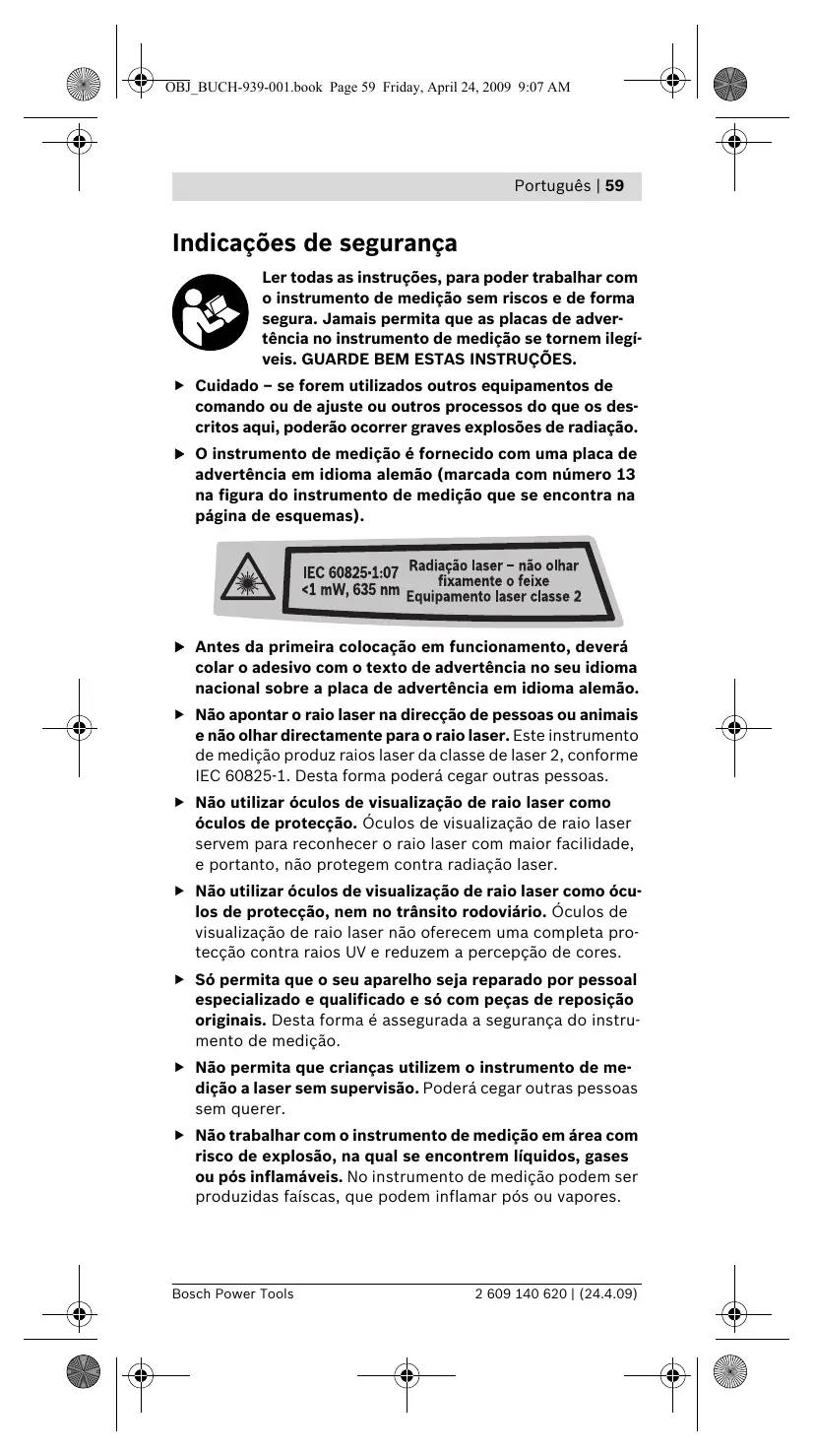 f Antes da primeira colocação em funcionamento, deverá colar o adesivo com o texto de advertência no seu idioma nacional sobre a placa de advertência em idioma alemão. f Não apontar o raio laser na direcção de pessoas ou animais e não olhar directamente para o raio laser. Este instrumento de medição produz raios laser da classe de laser 2, conforme IEC 60825-1. Desta forma poderá cegar outras pessoas. f Não utilizar óculos de visualização de raio laser como óculos de protecção. Óculos de visualização de raio laser servem para reconhecer o raio laser com maior facilidade, e portanto, não protegem contra radiação laser. f Não utilizar óculos de visualização de raio laser como óculos de protecção, nem no trânsito rodoviário. Óculos de visualização de raio laser não oferecem uma completa protecção contra raios UV e reduzem a percepção de cores. f Só permita que o seu aparelho seja reparado por pessoal especializado e qualificado e só com peças de reposição originais. Desta forma é assegurada a segurança do instrumento de medição. f Não permita que crianças utilizem o instrumento de medição a laser sem supervisão. Poderá cegar outras pessoas sem querer. f Não trabalhar com o instrumento de medição em área com risco de explosão, na qual se encontrem líquidos, gases ou pós inflamáveis. No instrumento de medição podem ser produzidas faíscas, que podem inflamar pós ou vapores.