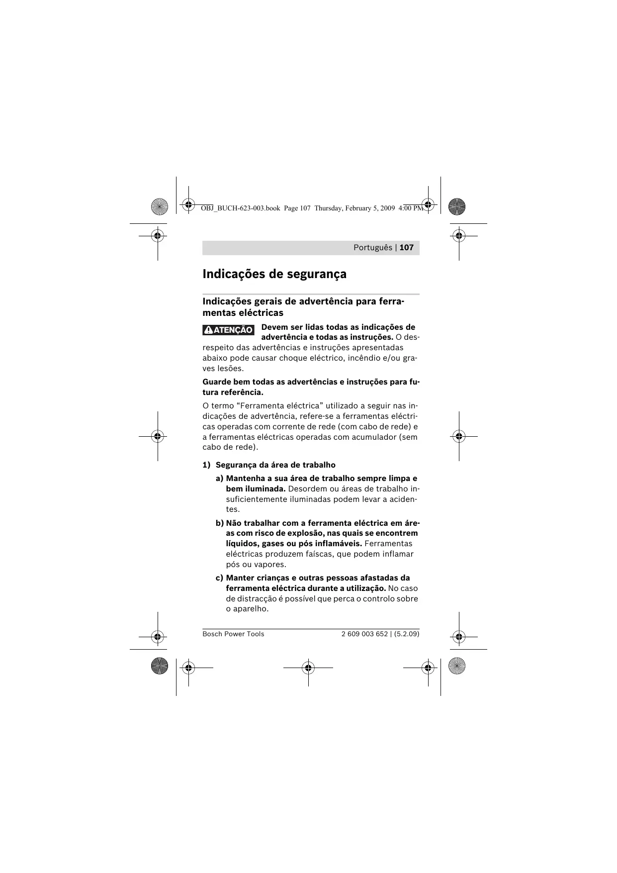Bosch Power Tools OBJ_BUCH-623-003.book Page 107 Thursday, February 5, 2009 4:00 PM Português | 107 Indicações de segurança