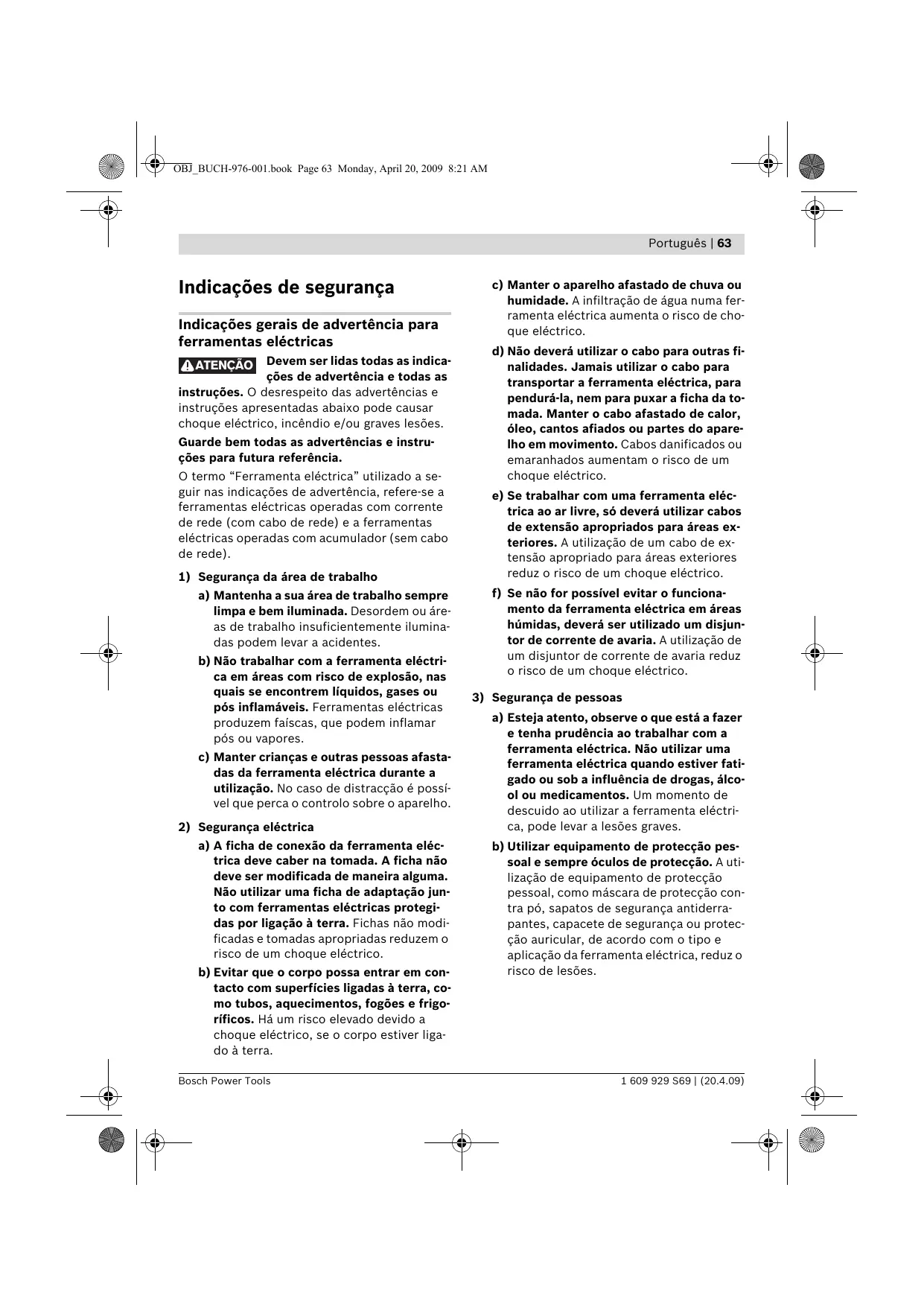 1 609 929 S69 | (20.4.09) Bosch Power Tools OBJ_BUCH-976-001.book Page 63 Monday, April 20, 2009 8:21 AM Português | 63 Indicações de segurança