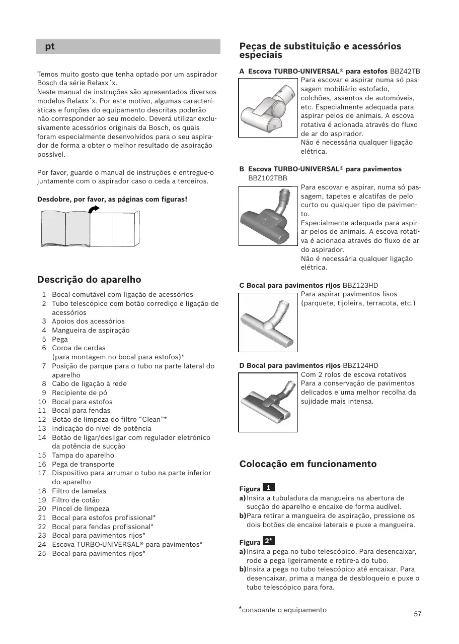 Temos muito gosto que tenha optado por um aspirador Bosch da série Relaxx´x. Neste manual de instruções são apresentados diversos modelos Relaxx´x. Por este motivo, algumas características e funções do equipamento descritas poderão não corresponder ao seu modelo. Deverá utilizar exclusivamente acessórios originais da Bosch, os quais foram especialmente desenvolvidos para o seu aspirador de forma a obter o melhor resultado de aspiração possível.