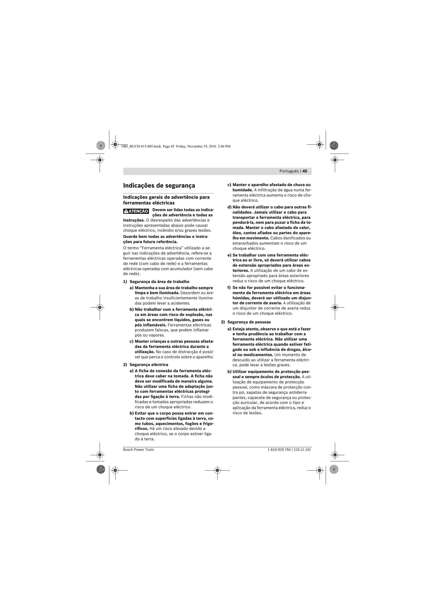 a) Esteja atento, observe o que está a fazer e tenha prudência ao trabalhar com a ferramenta eléctrica. Não utilizar uma ferramenta eléctrica quando estiver fatigado ou sob a influência de drogas, álcool ou medicamentos. Um momento de descuido ao utilizar a ferramenta eléctrica, pode levar a lesões graves. b) Utilizar equipamento de protecção pessoal e sempre óculos de protecção. A utilização de equipamento de protecção pessoal, como máscara de protecção contra pó, sapatos de segurança antiderrapantes, capacete de segurança ou protecção auricular, de acordo com o tipo e aplicação da ferramenta eléctrica, reduz o risco de lesões. 1 619 929 764 | (19.11.10) OBJ_BUCH-415-005.book Page 46 Friday, November 19, 2010 2:46 PM 46 | Português c) Evitar uma colocação em funcionamento involuntária. Assegure-se de que a ferramenta eléctrica esteja desligada, antes de conectá-la à alimentação de rede e/ou ao acumulador, antes de levantá-la ou de transportá-la. Se tiver o dedo no interruptor ao transportar a ferramenta eléctrica ou se o aparelho for conectado à alimentação de rede enquanto estiver ligado, poderão ocorrer acidentes. d) Remover ferramentas de ajuste ou chaves de boca antes de ligar a ferramenta eléctrica. Uma ferramenta ou chave que se encontre numa parte do aparelho em movimento pode levar a lesões. e) Evite uma posição anormal. Mantenha uma posição firme e mantenha sempre o equilíbrio. Desta forma é mais fácil controlar a ferramenta eléctrica em situações inesperadas. f) Usar roupa apropriada. Não usar roupa larga nem jóias. Mantenha os cabelos, roupas e luvas afastadas de partes em movimento. Roupas frouxas, cabelos longos ou jóias podem ser agarrados por peças em movimento. g) Se for possível montar dispositivos de aspiração ou de recolha, assegure-se de que estejam conectados e utilizados correctamente. A utilização de uma aspiração de pó pode reduzir o perigo devido ao pó.