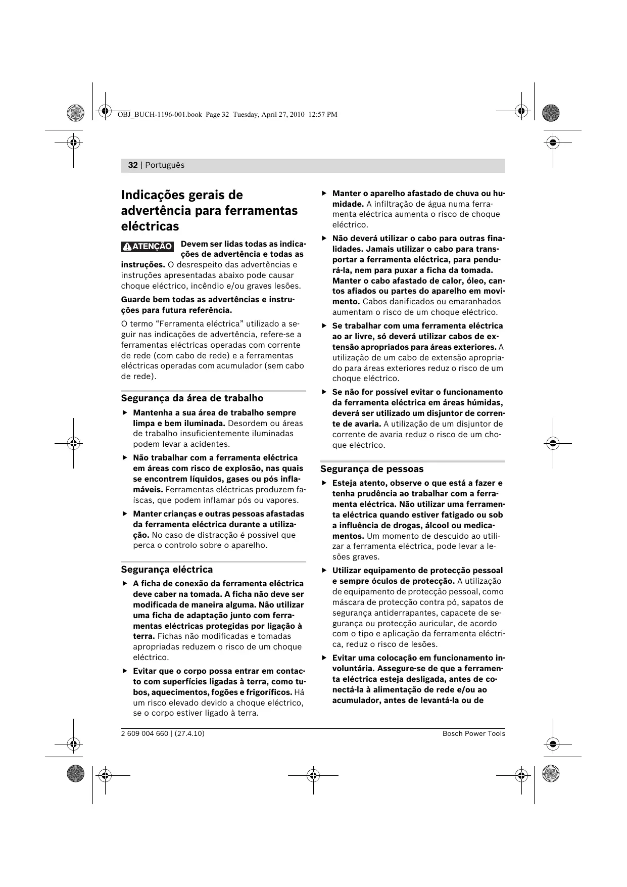 2 609 004 660 | (27.4.10) OBJ_BUCH-1196-001.book Page 32 Tuesday, April 27, 2010 12:57 PM 32 | Português Indicações gerais de advertência para ferramentas eléctricas