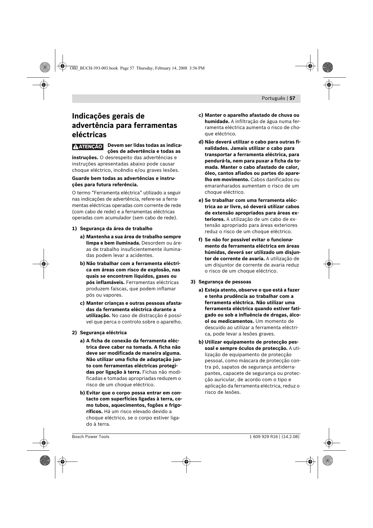 a) Esteja atento, observe o que está a fazer e tenha prudência ao trabalhar com a ferramenta eléctrica. Não utilizar uma ferramenta eléctrica quando estiver fatigado ou sob a influência de drogas, álcool ou medicamentos. Um momento de descuido ao utilizar a ferramenta eléctrica, pode levar a lesões graves. b) Utilizar equipamento de protecção pessoal e sempre óculos de protecção. A utilização de equipamento de protecção pessoal, como máscara de protecção contra pó, sapatos de segurança antiderrapantes, capacete de segurança ou protecção auricular, de acordo com o tipo e aplicação da ferramenta eléctrica, reduz o risco de lesões. 1 609 929 R16 | (14.2.08) OBJ_BUCH-393-003.book Page 58 Thursday, February 14, 2008 3:56 PM 58 | Português c) Evitar uma colocação em funcionamento involuntária. Assegure-se de que a ferramenta eléctrica esteja desligada, antes de conectá-la à alimentação de rede e/ou ao acumulador, antes de levantá-la ou de transportá-la. Se tiver o dedo no interruptor ao transportar a ferramenta eléctrica ou se o aparelho for conectado à alimentação de rede enquanto estiver ligado, poderão ocorrer acidentes. d) Remover ferramentas de ajuste ou chaves de boca antes de ligar a ferramenta eléctrica. Uma ferramenta ou chave que se encontre numa parte do aparelho em movimento pode levar a lesões. e) Evite uma posição anormal. Mantenha uma posição firme e mantenha sempre o equilíbrio. Desta forma é mais fácil controlar a ferramenta eléctrica em situações inesperadas. f) Usar roupa apropriada. Não usar roupa larga nem jóias. Mantenha os cabelos, roupas e luvas afastadas de partes em movimento. Roupas frouxas, cabelos longos ou jóias podem ser agarrados por peças em movimento. g) Se for possível montar dispositivos de aspiração ou de recolha, assegure-se de que estejam conectados e utilizados correctamente. A utilização de uma aspiração de pó pode reduzir o perigo devido ao pó.