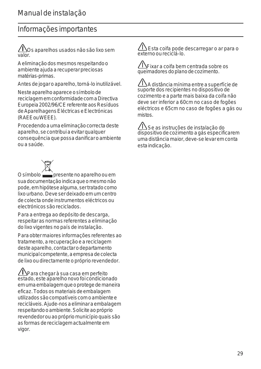 Manual de instalação Informações importantes Os aparelhos usados não são lixo sem valor. Esta coifa pode descarregar o ar para o externo ou reciclá-lo. A eliminação dos mesmos respeitando o ambiente ajuda a recuperar preciosas matérias-primas. Fixar a coifa bem centrada sobre os queimadores do plano de cozimento. Antes de jogar o aparelho, torná-lo inutilizável. Neste aparelho aparece o símbolo de reciclagem em conformidade com a Directiva Europeia 2002/96/CE referente aos Resíduos de Aparelhagens Eléctricas e Electrónicas (RAEE ou WEEE). Procedendo a uma eliminação correcta deste aparelho, se contribui a evitar qualquer consequência que possa danificar o ambiente ou a saúde. A distância mínima entre a superfície de suporte dos recipientes no dispositivo de cozimento e a parte mais baixa da coifa não deve ser inferior a 60cm no caso de fogões eléctricos e 65cm no caso de fogões a gás ou mistos. Se as instruções de instalação do dispositivo de cozimento a gás especificarem uma distância maior, deve-se levar em conta esta indicação. O símbolo presente no aparelho ou em sua documentação indica que o mesmo não pode, em hipótese alguma, ser tratado como lixo urbano. Deve ser deixado em um centro de colecta onde instrumentos eléctricos ou electrónicos são reciclados. Para a entrega ao depósito de descarga, respeitar as normas referentes a eliminação do lixo vigentes no país de instalação. Para obter maiores informações referentes ao tratamento, a recuperação e a reciclagem deste aparelho, contactar o departamento municipal competente, a empresa de colecta de lixo ou directamente o próprio revendedor. Para chegar à sua casa em perfeito estado, este aparelho novo foi condicionado em uma embalagem que o protege de maneira eficaz. Todos os materiais de embalagem utilizados são compatíveis com o ambiente e recicláveis. Ajude-nos a eliminar a embalagem respeitando o ambiente. Solicite ao próprio revendedor ou ao próprio município quais são as formas de reciclagem actualmente em vigor.